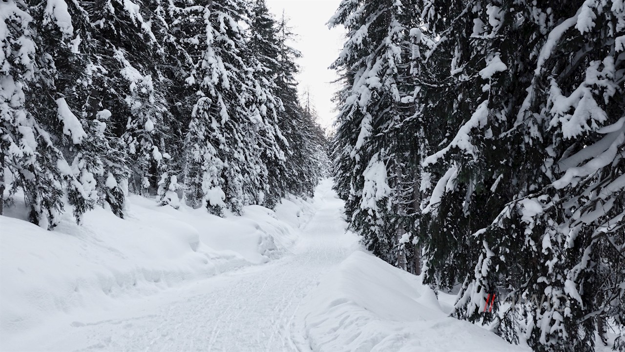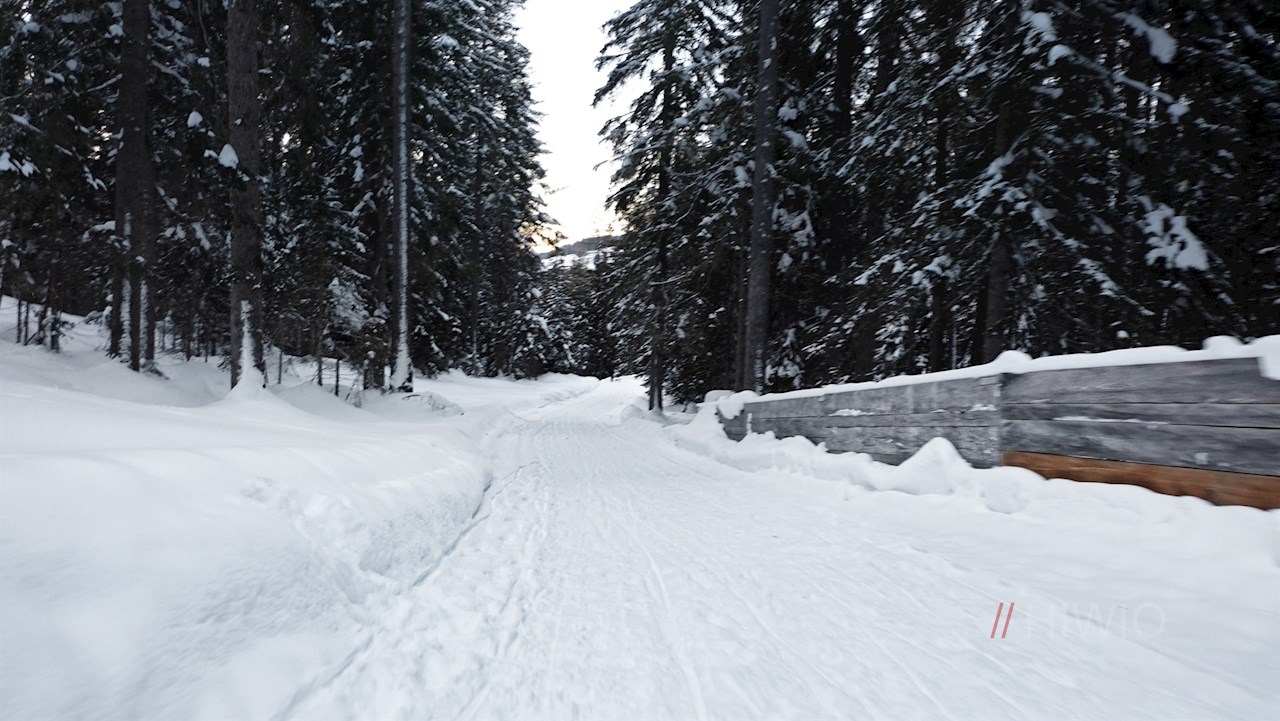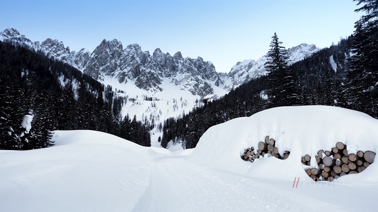 Vom Parkplatz folgt man ein kurzes Stück der Straße in Richtung Sexten, wechselt auf dem nahen Zebrastreifen die Straßenseite und gelangt über eine kleine Holzbrücke auf den Spazierweg Nr. 105. Er führt entlang des leise plätschernden Sextner Baches durch die idyllische Winterlandschaft.