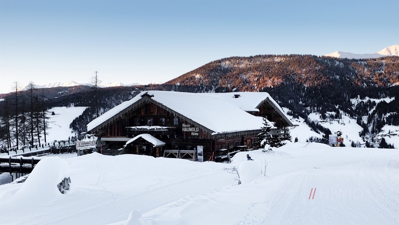 Nun ist die beliebte Riese Haunold Hütte nicht mehr fern. Auf der aussichtsreichen Terrasse und in den kuschelig warmen Stuben werden den Gästen auch im Winter kulinarische Genussmomente bereitet.