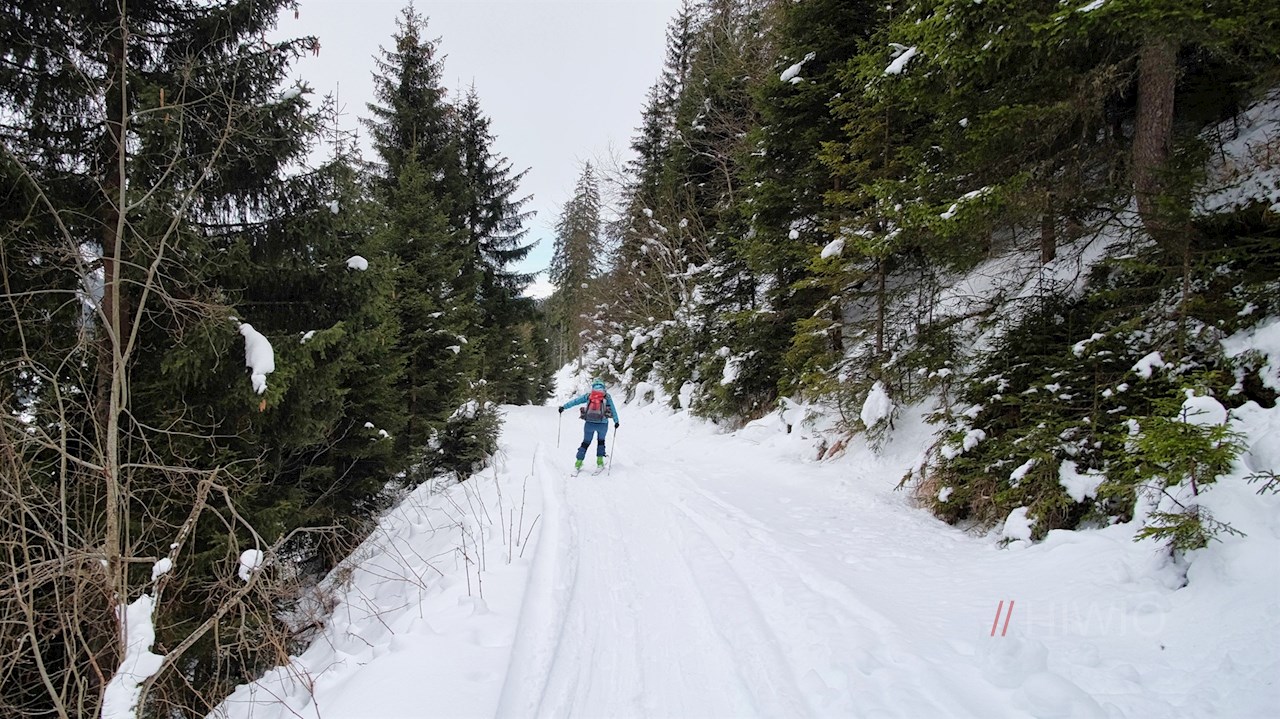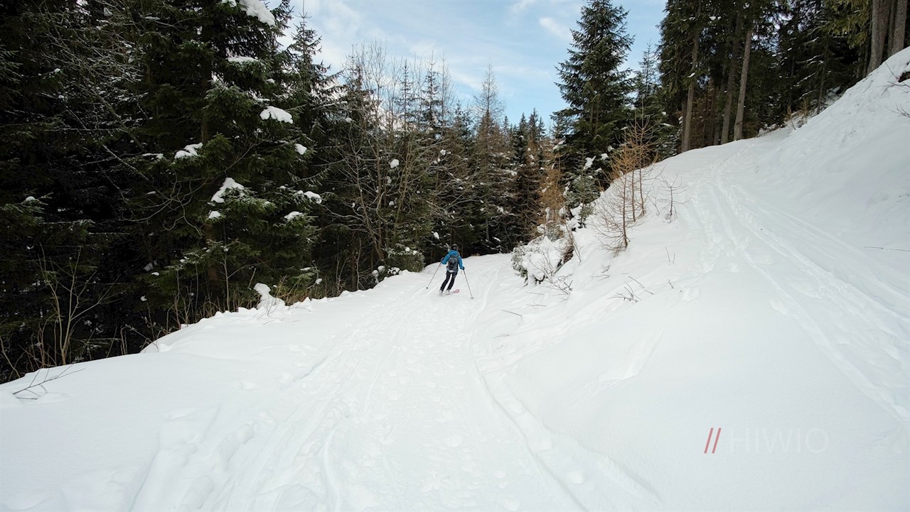 Nunmehr der Wegnummer 29B in Richtung Zunderspitzhütte folgend, führt der Wanderweg in angenehmer Steigung durch den winterlich verschneiten Wald.