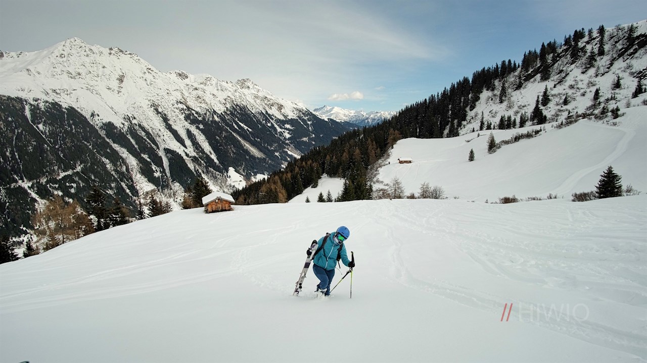 Nun folgt der letzte Anstieg über die schneebedeckten Hänge zur Zunderspitzhütte auf 1.910 m Höhe.