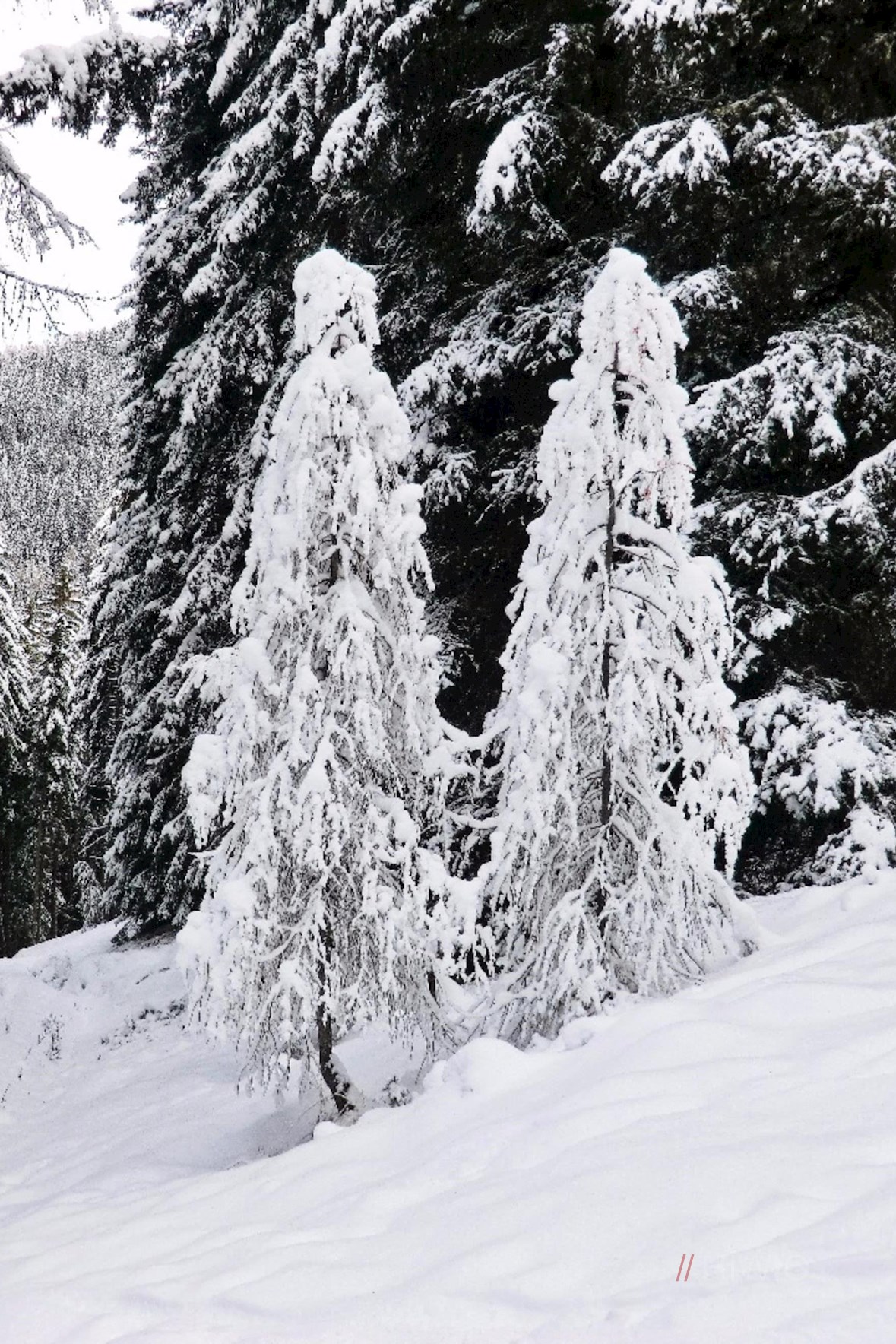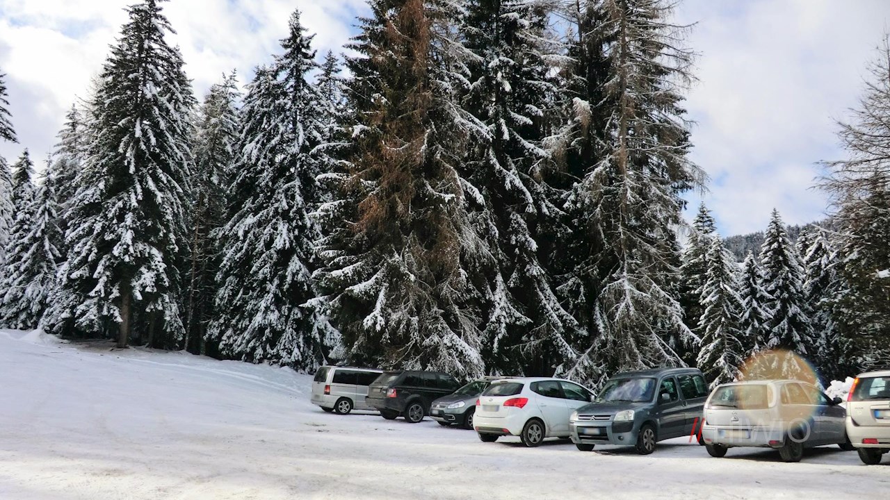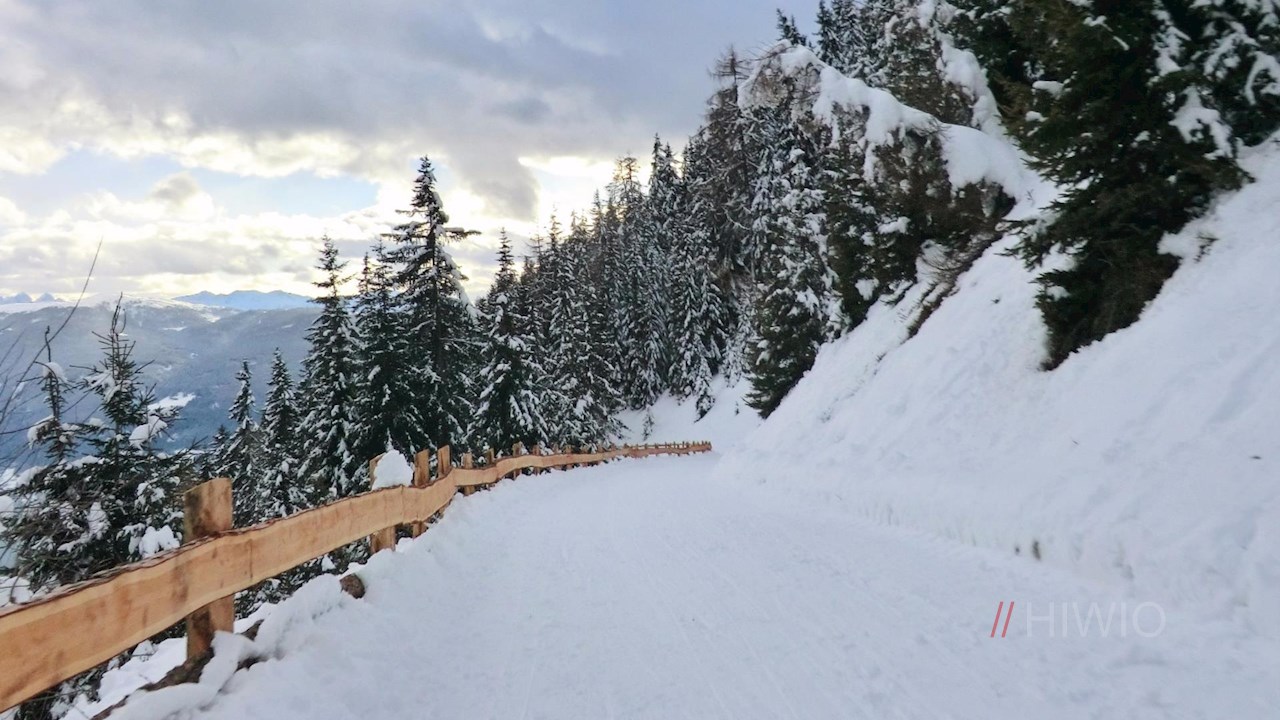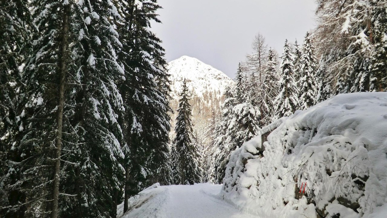 Am Parkplatz schlägt man den breiten Forstweg Nr. 65 ein, der auch unter dem Namen „Murmeltierweg“ bekannt ist. Er führt im sanften Anstieg durch den winterlich verschneiten Nadelwald, der ab und an Blicke auf das Pustertal und die gegenüberliegende Bergwelt freigibt.