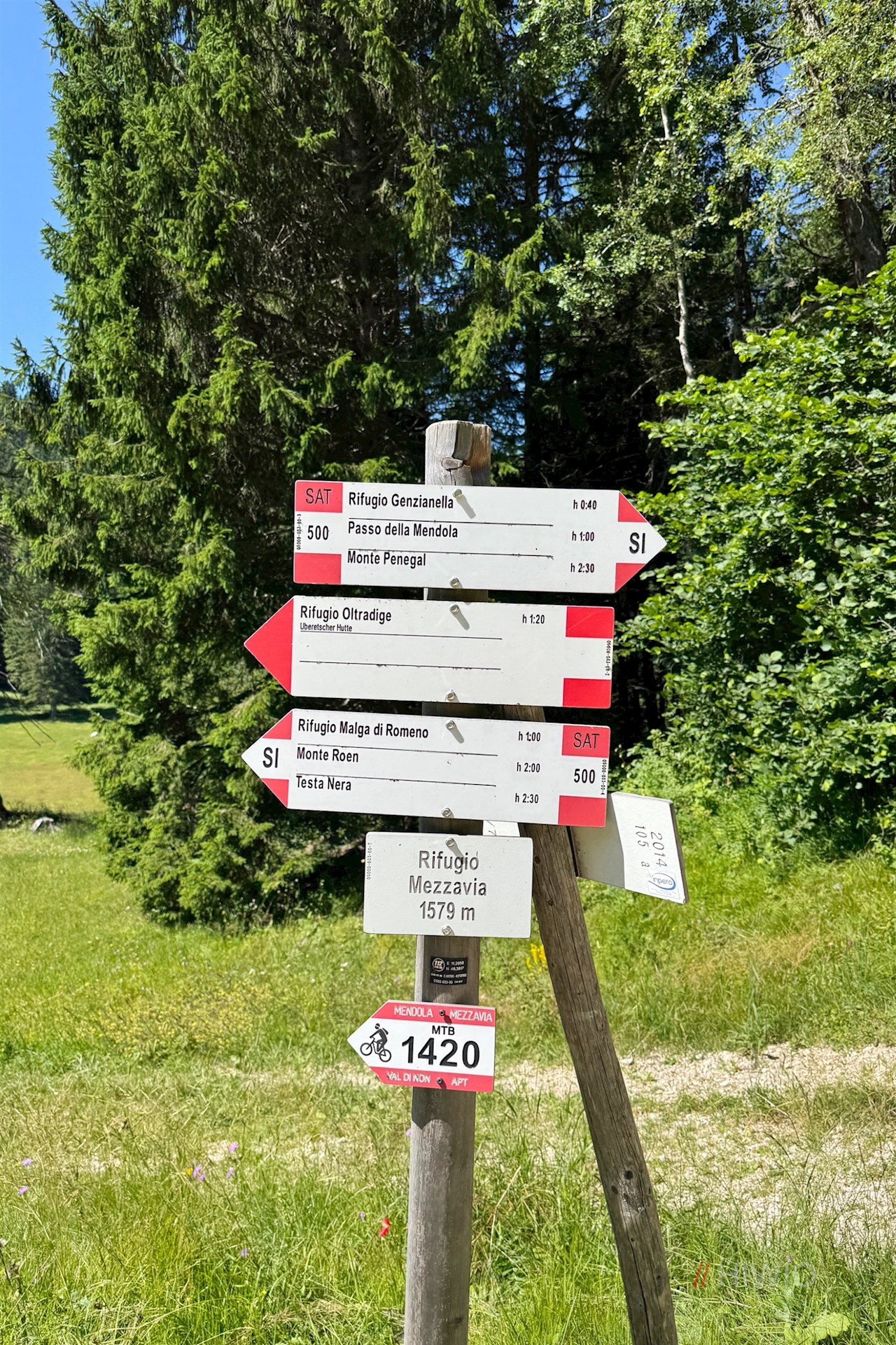 Stets der Wegnummer 500 Richtung Roen folgend, taucht der breite Wanderweg wenig später in den schattenverheißenden Wald ein, durch den er sich an der einladenden Enzianhütte und zahlreichen „Mendelhütten“ vorbei im angenehmen, bisweilen etwas steileren Anstieg seinen Weg bahnt.