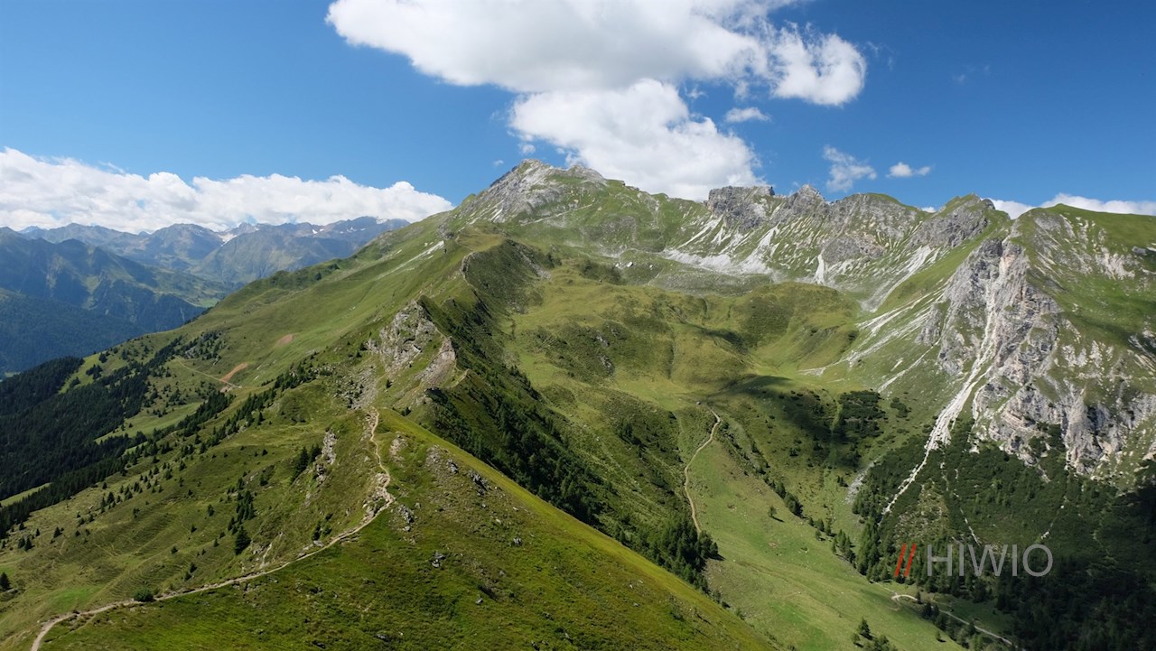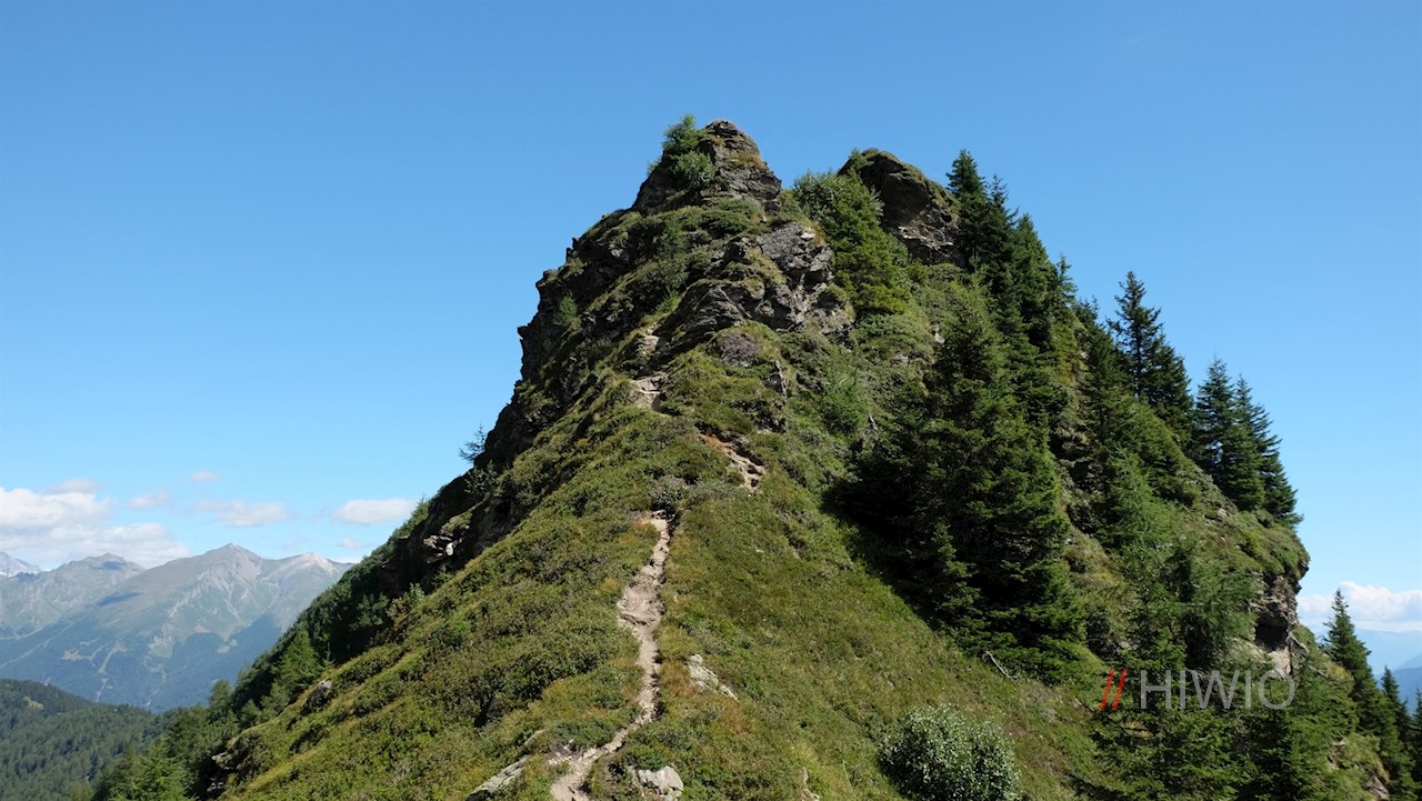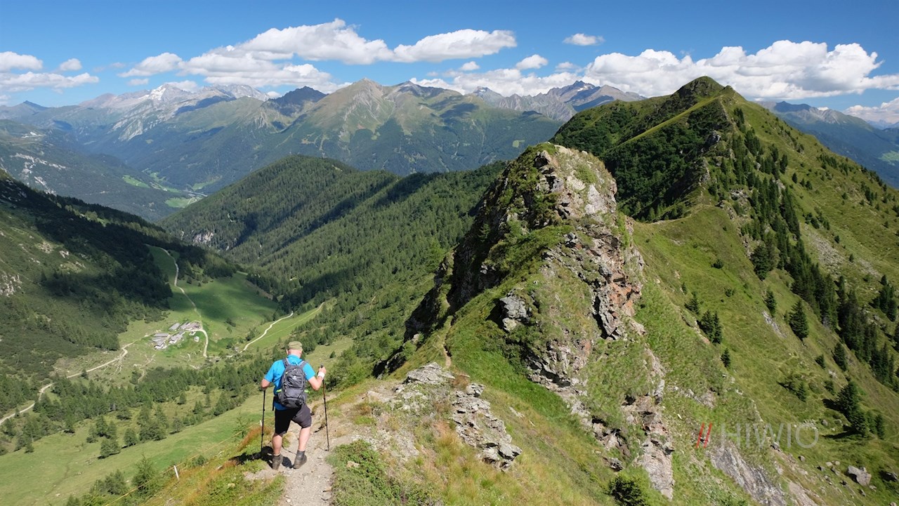 Mit Blick auf die anmutigen Telfer Weißen und die tiefer liegende Vallmingalm windet sich der nunmehr schmale Steig im wechselnden Auf und Ab über einen teils felsigen, teils steil abfallenden Grat, der den Wanderern eine gewisse Trittsicherheit und Schwindelfreiheit abverlangt.