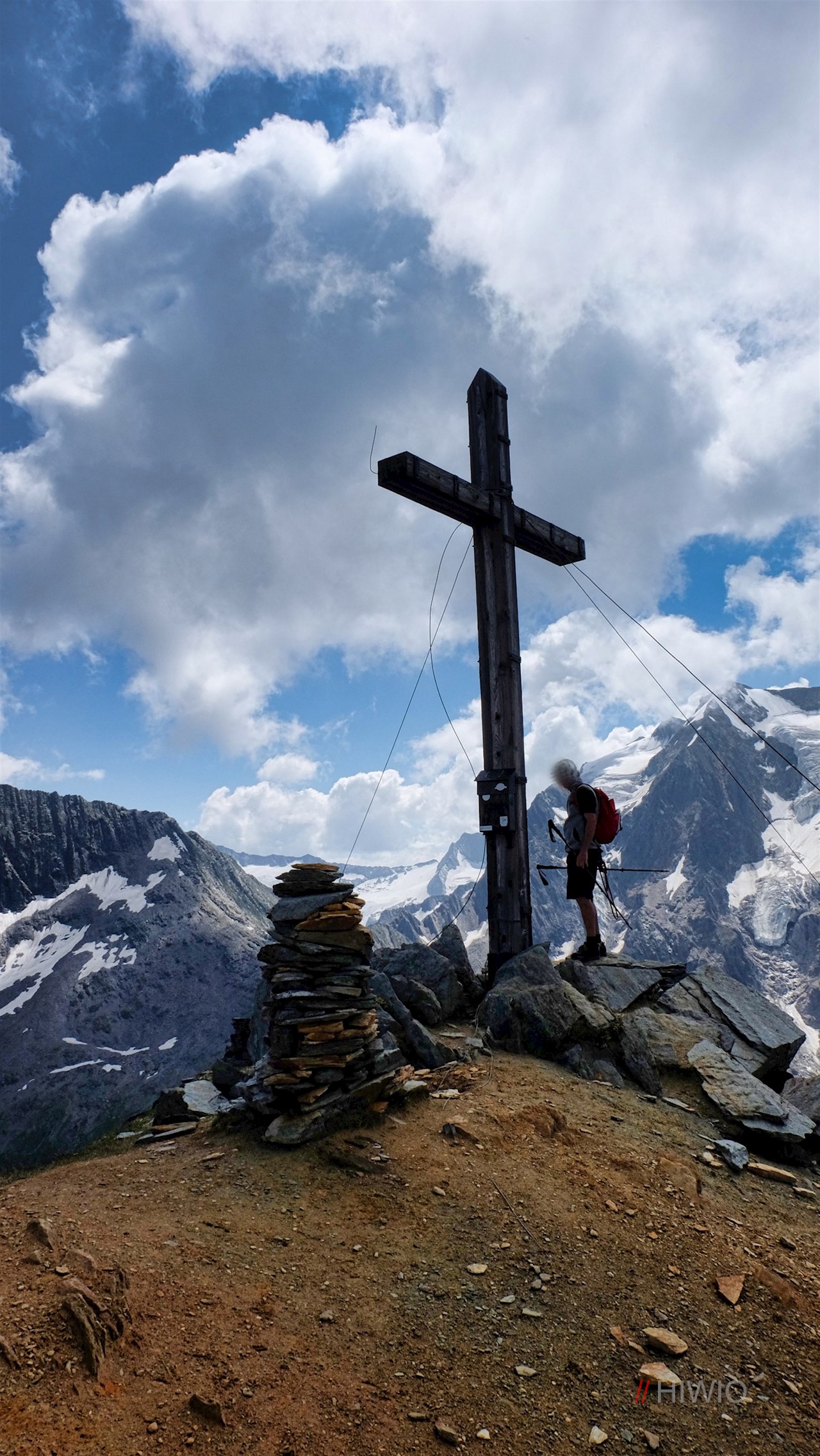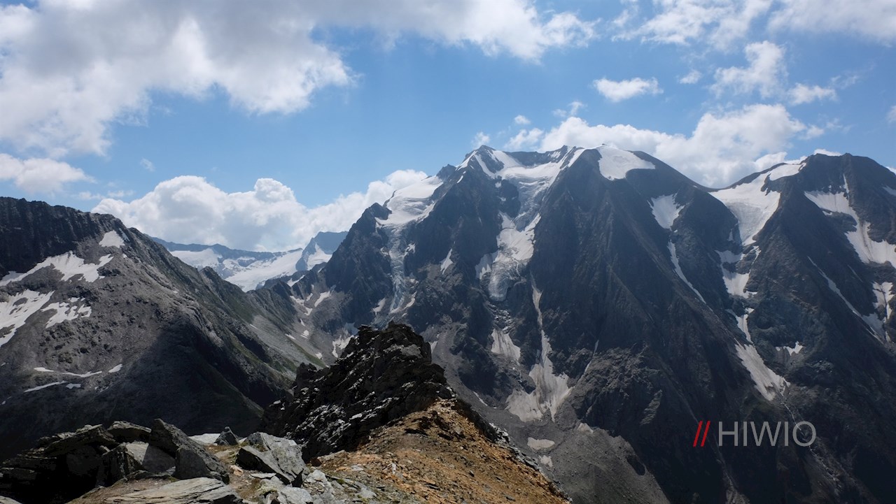 Neben ihrem Gipfelkreuz entfaltet sich schließlich ein berückender Ausblick auf die umliegenden Berge und das tiefer liegende Pfitschtal. Am beeindruckendsten mag aber der Blick auf die vergletscherten Nordwände des nahen Hochfernermassivs sein.