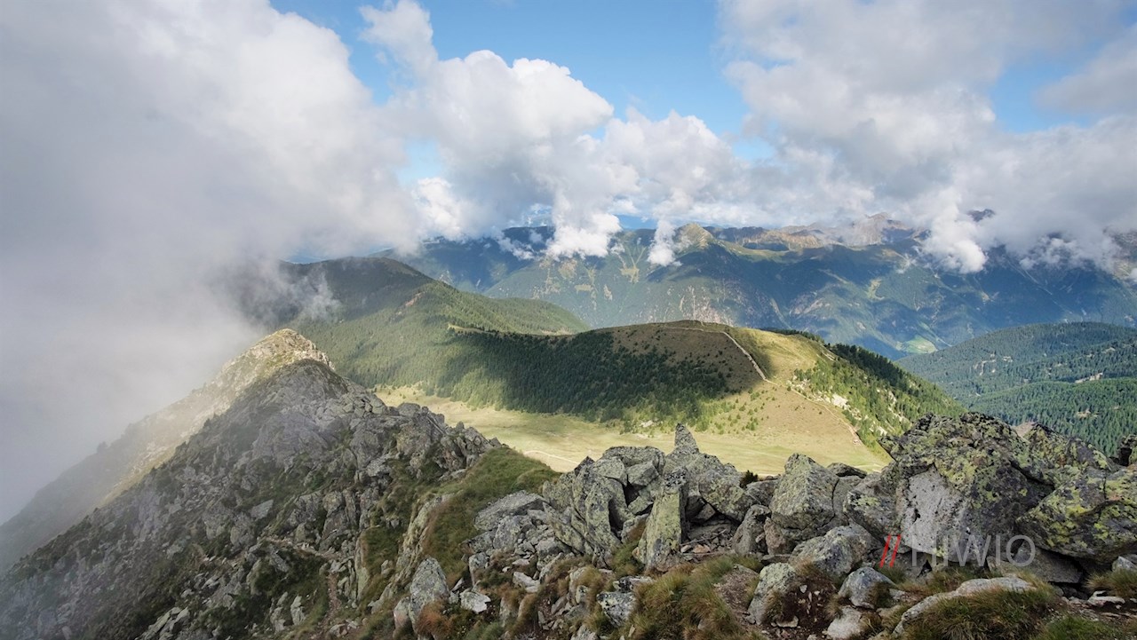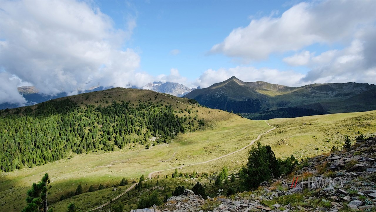 Auf 2.448 m Höhe erschließt sich schließlich ein unvergesslich schöner Ausblick auf die ringsum aufragende Bergwelt mit den bleichen Dolomiten auf der einen und der Rieserfernergruppe auf der anderen Seite.