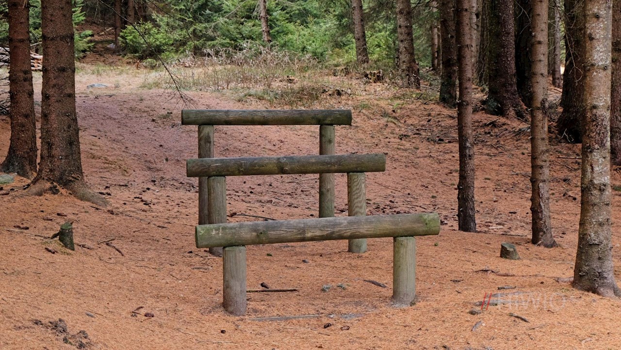 Nach einem kurzen Anstieg gelangt man zum eigentlichen Beginn des Rundwegs, der sich zunächst nahezu eben bzw. leicht abfallend durch den lichten Wald schlängelt. Entlang des Weges laden einige Trimm-Dich-Stationen zu kleinen Trainingseinheiten ein.