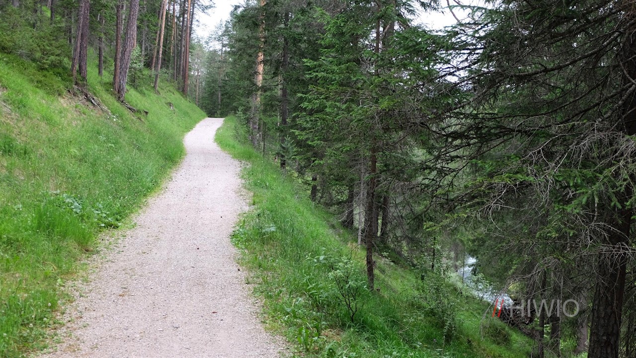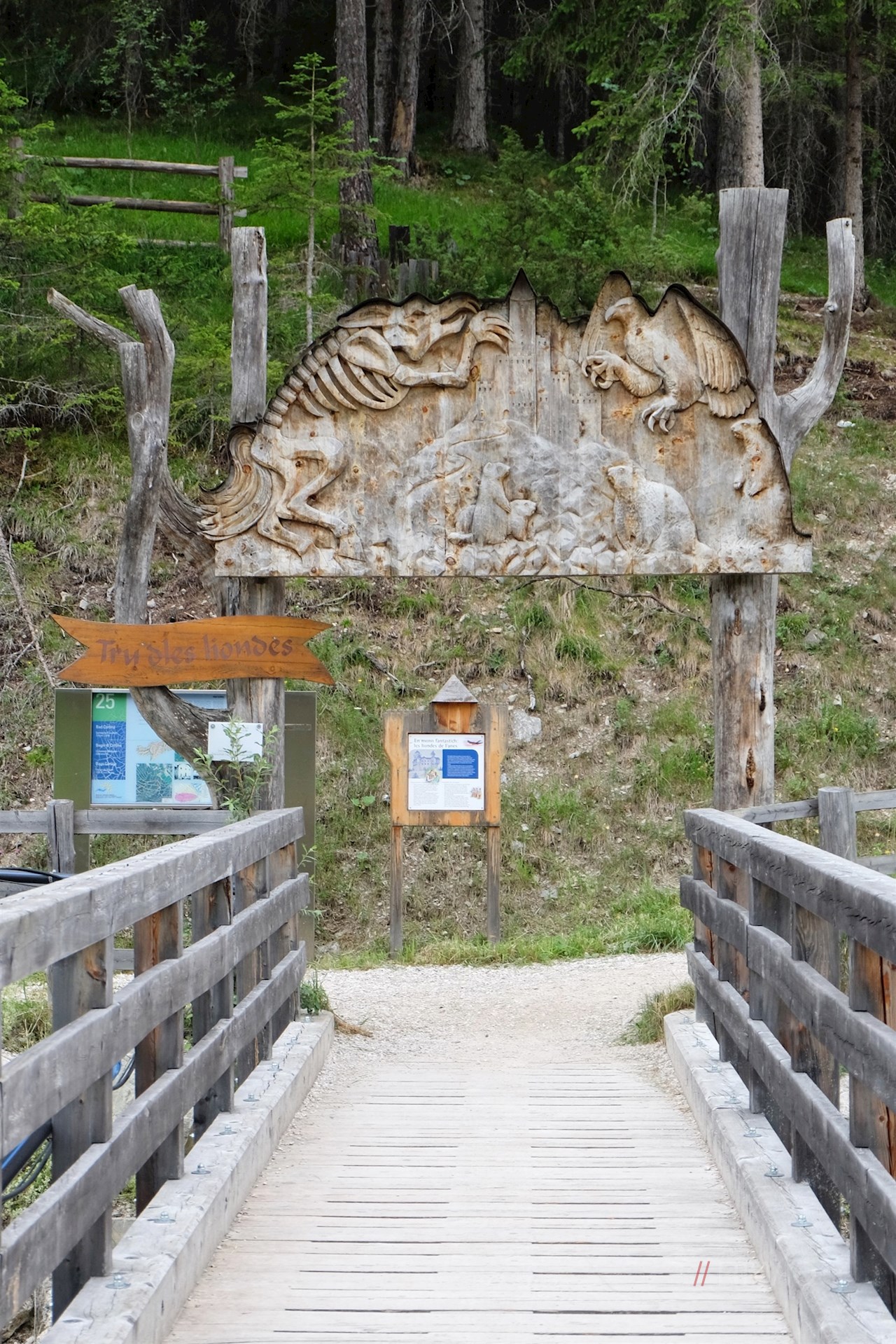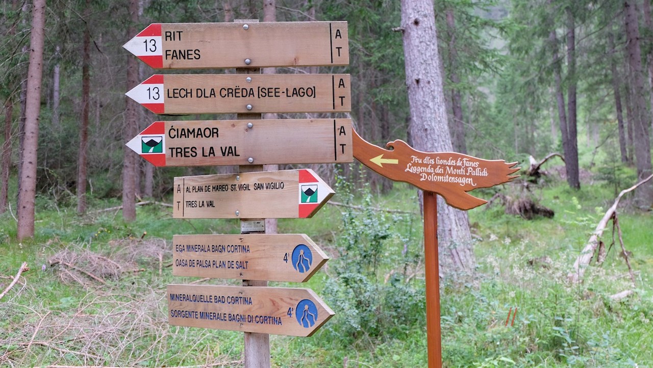 Den kunstfertig geschnitzten Wegweisern mit der Aufschrift „Tru dles liondes“ folgend, überquert man zunächst den rauschenden St.-Vigil-Bach und taucht sogleich in einen friedvollen Nadelwald ein.