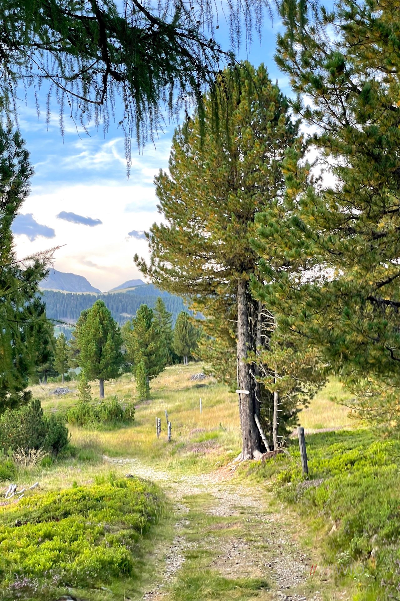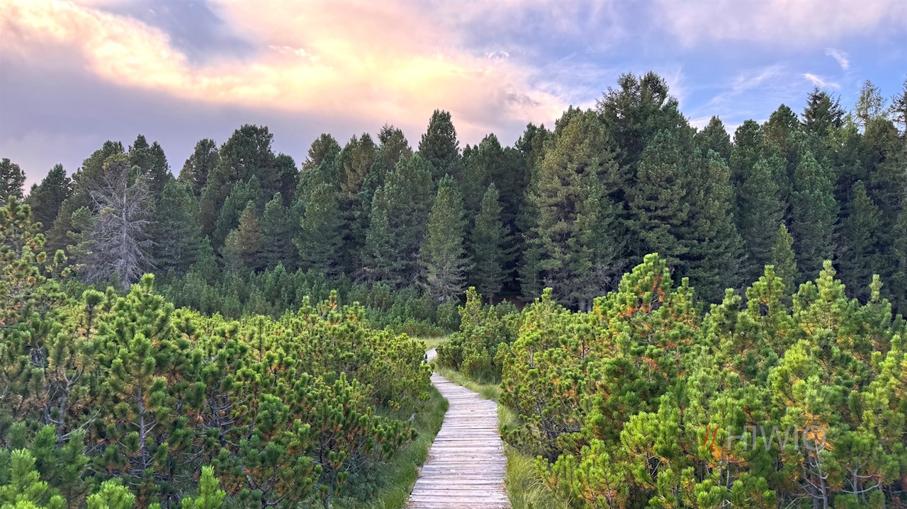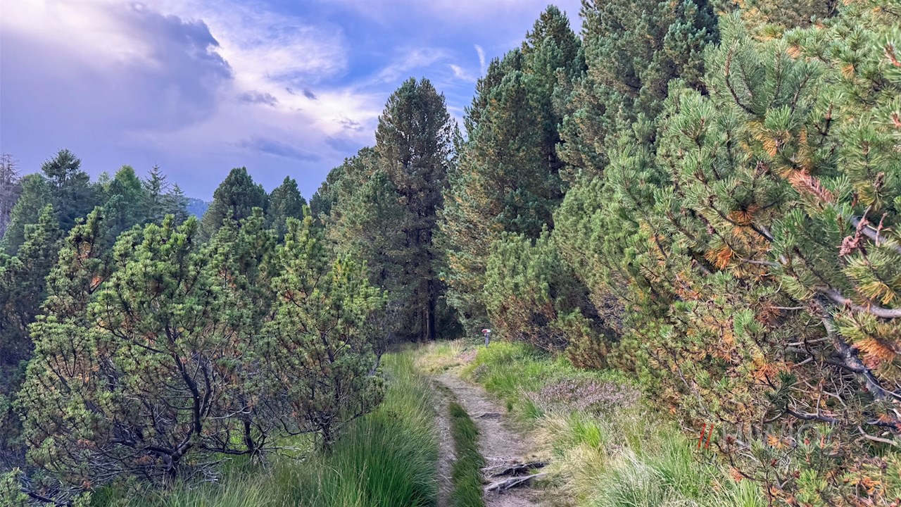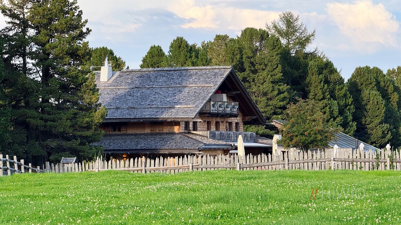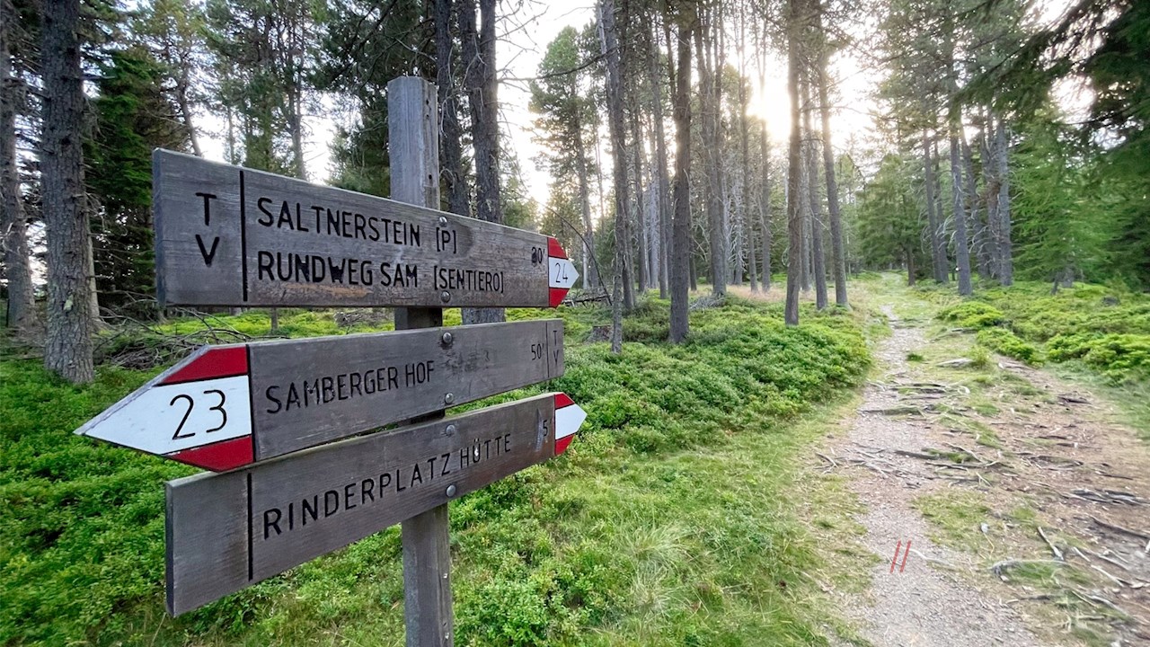 Schließlich gelangt man an eine Weggabelung. Weiterhin der Wegnummer 23 folgend, zieht sich der nunmehr sanftere Wanderweg durch weitläufige, von aromatisch duftenden Latschen und Zirben bewachsene Almwiesen und lichten Wald zur nahen Rinderplatz Hütte. Unterwegs öffnen sich schöne Ausblicke auf die weitläufige Villanderer Alm, den Villanderer Berg, das Rittner Horn und den Königsanger.
