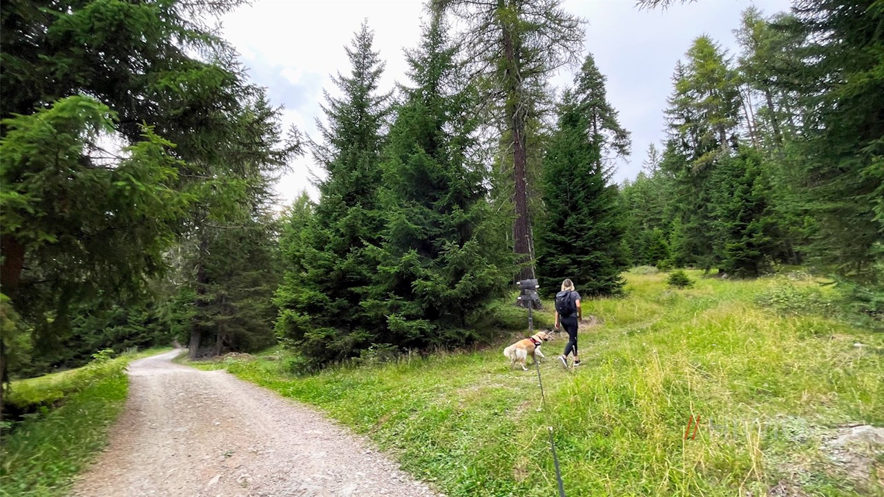 Hier weist auch das Wanderschild Nr. 20 den Weg auf die Villanderer Alm. Er folgt zunächst der asphaltierten Almstraße und geht kurz darauf in einen rechts abzweigenden, breiten Waldweg über.