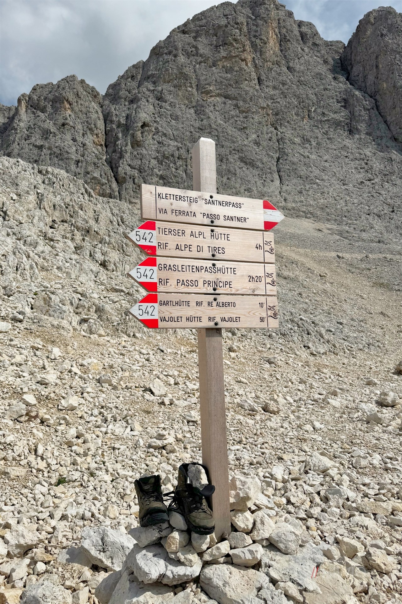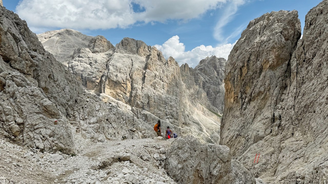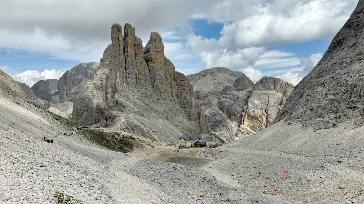 Nun ist die Santnerpasshütte nicht mehr fern: Weiterhin der Wegnummer 542 folgend, zieht sich die Wanderung durch das schotterreiche Gartl, den „Rosengarten“ des sagenumwobenen Königs Laurin, zur bereits sichtbaren Santnerpasshütte.