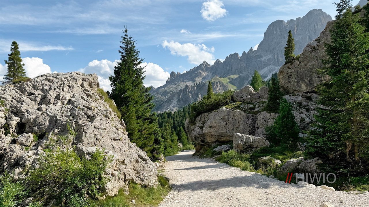 Dem Wanderschild Nr. 540 in Richtung Vaiolet e Preuss folgend, taucht der breite Wanderweg alsbald in einen schütteren Wald ein, durch den er sich sanft zur einladenden Gardeccia-Hütte zieht.