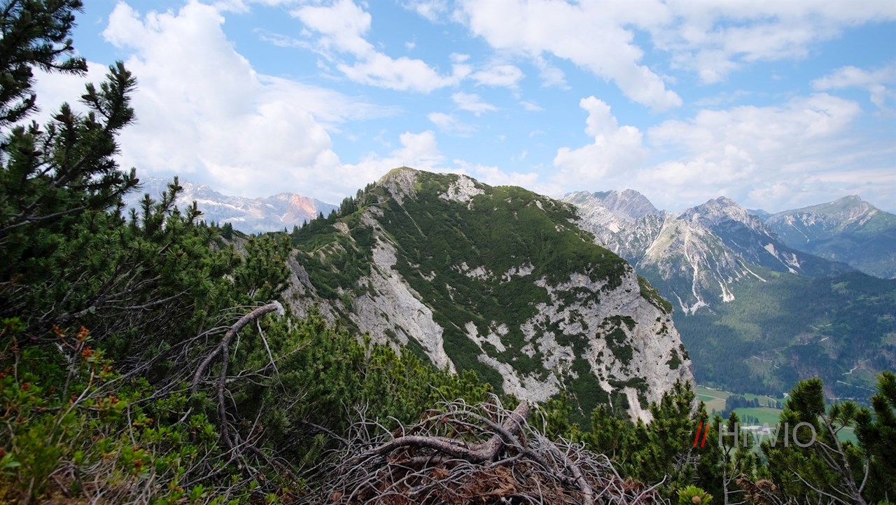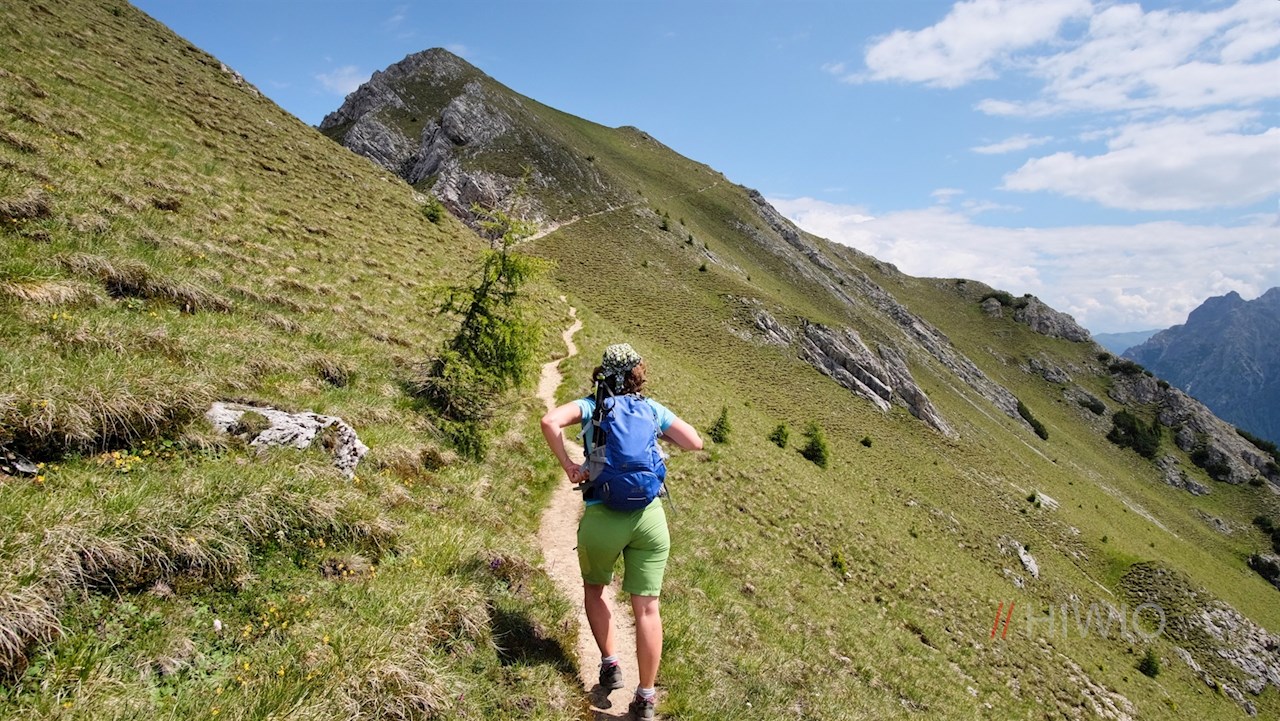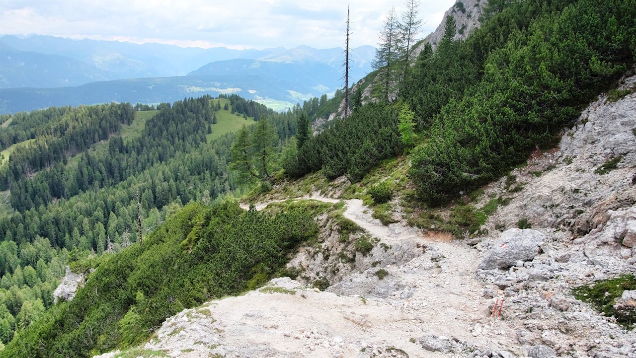 Weiterhin der Wegnummer 33 folgend, quert der schmale Steig nun teils steil abfallende Grashänge. Zwei ausgesetzte felsige Passagen sind mit Halteseilen gesichert und dürften daher für berggewohnte Wanderer recht einfach zu meistern sein.