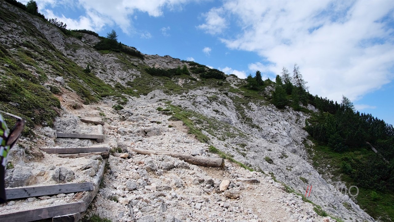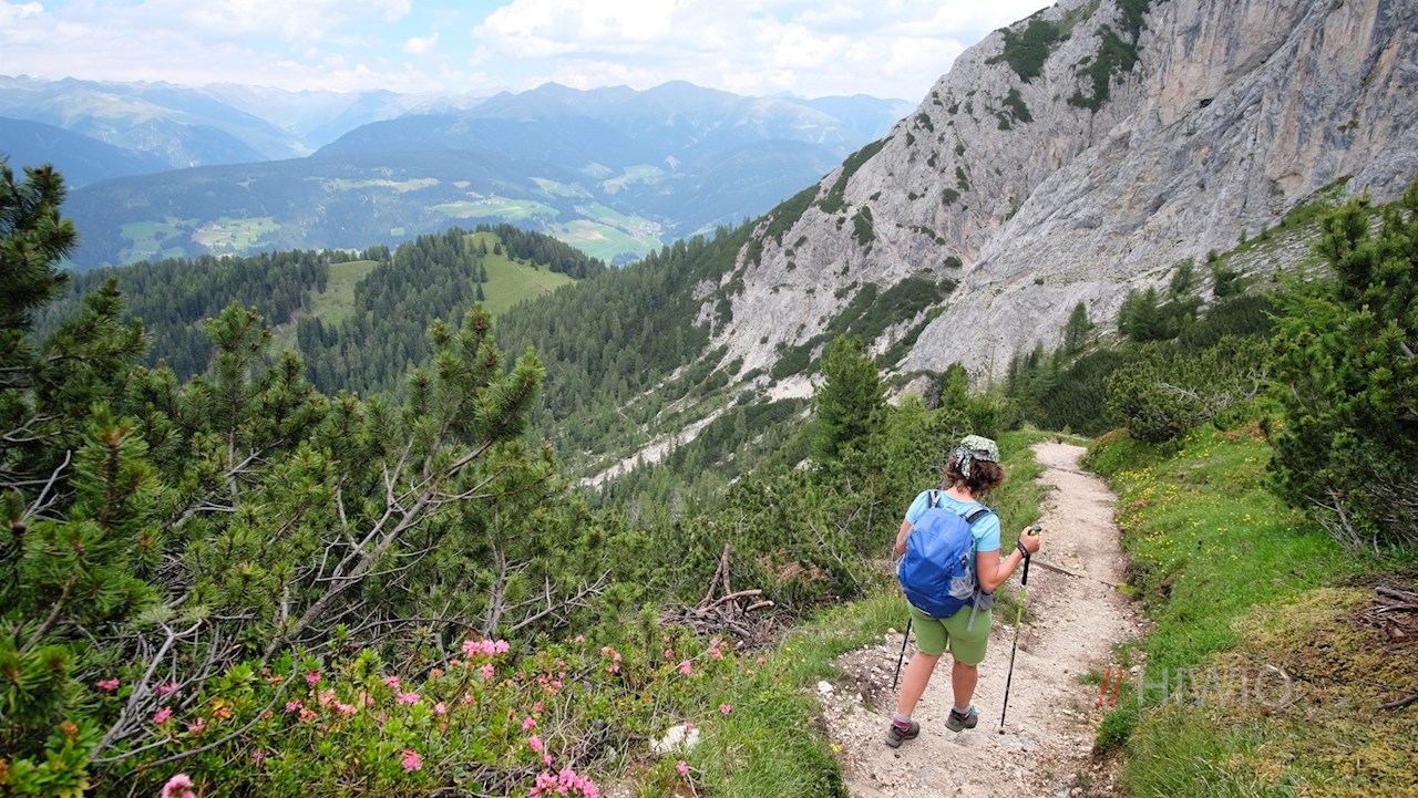 Hinter der Putzalm zweigt der Weg Nr. 16/16B in Richtung Sarlkofel ab. Nahe der Waldgrenze geht er in den Steig Nr. 33 über, der im nunmehr recht steilen Anstieg auf den 2.230 m hohen Sarlsattel führt.