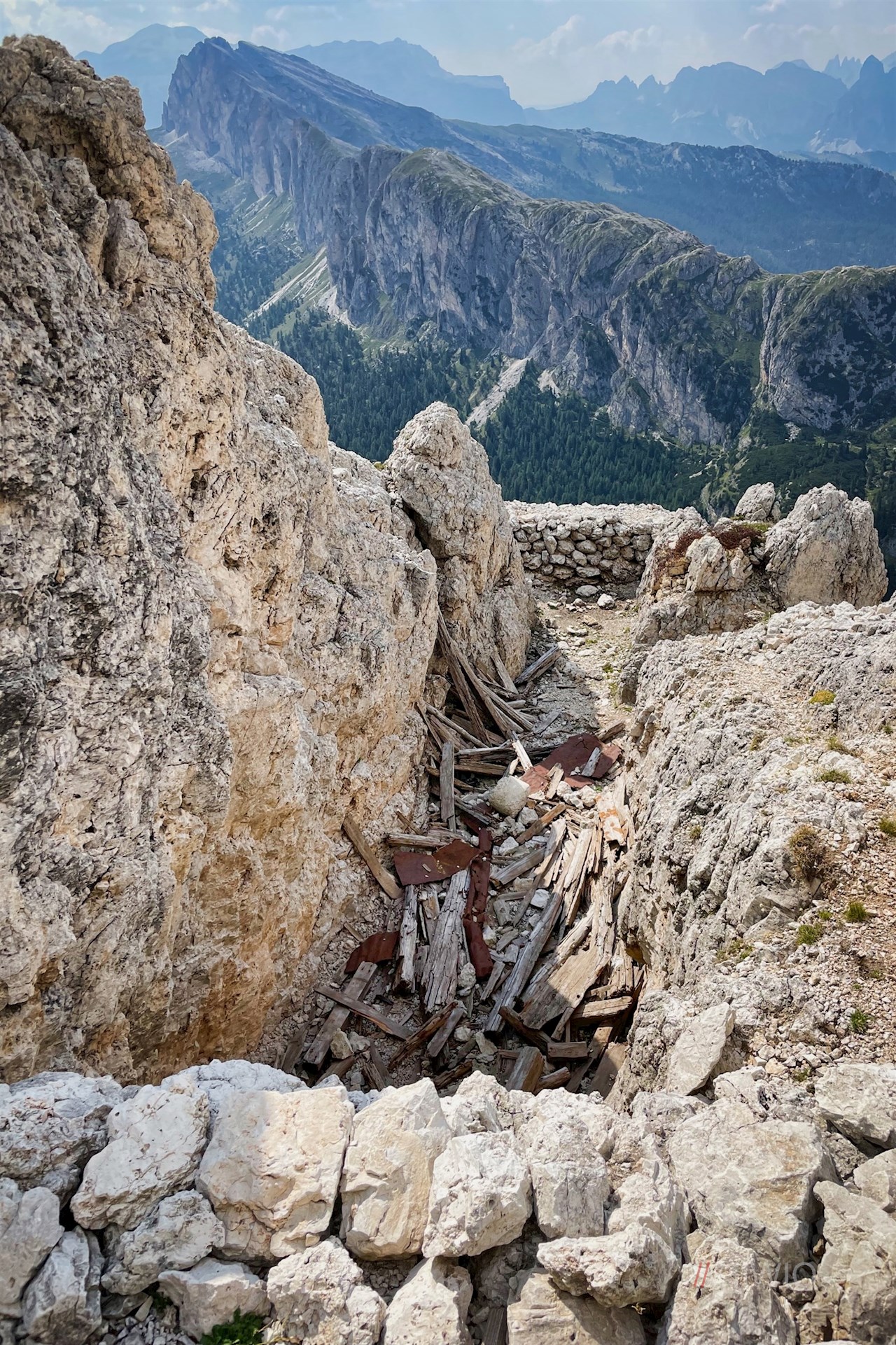 Dem historischen Maultierpfad Nr. 30 in Richtung Sass de Stria folgend, führt die Wanderung zunächst über die schrofigen Bergwiesenhänge auf ein von restaurierten Schützengräben und alten Stellungen durchzogenes Plateau, über welches die rotweißen Markierungen und Pfeile den Weg weisen.