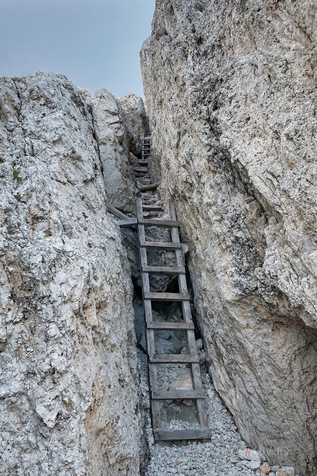 Zuletzt folgt der anspruchsvollste Teil der Wanderung: die leichte Kletterei (Klettersteig A/B) über eine schmale, mit Holzplanken, Halteseilen, Holz- und Stahlleitern gesicherte Steilrinne zum aussichtsreichen Gipfel des Sass de Stria.
