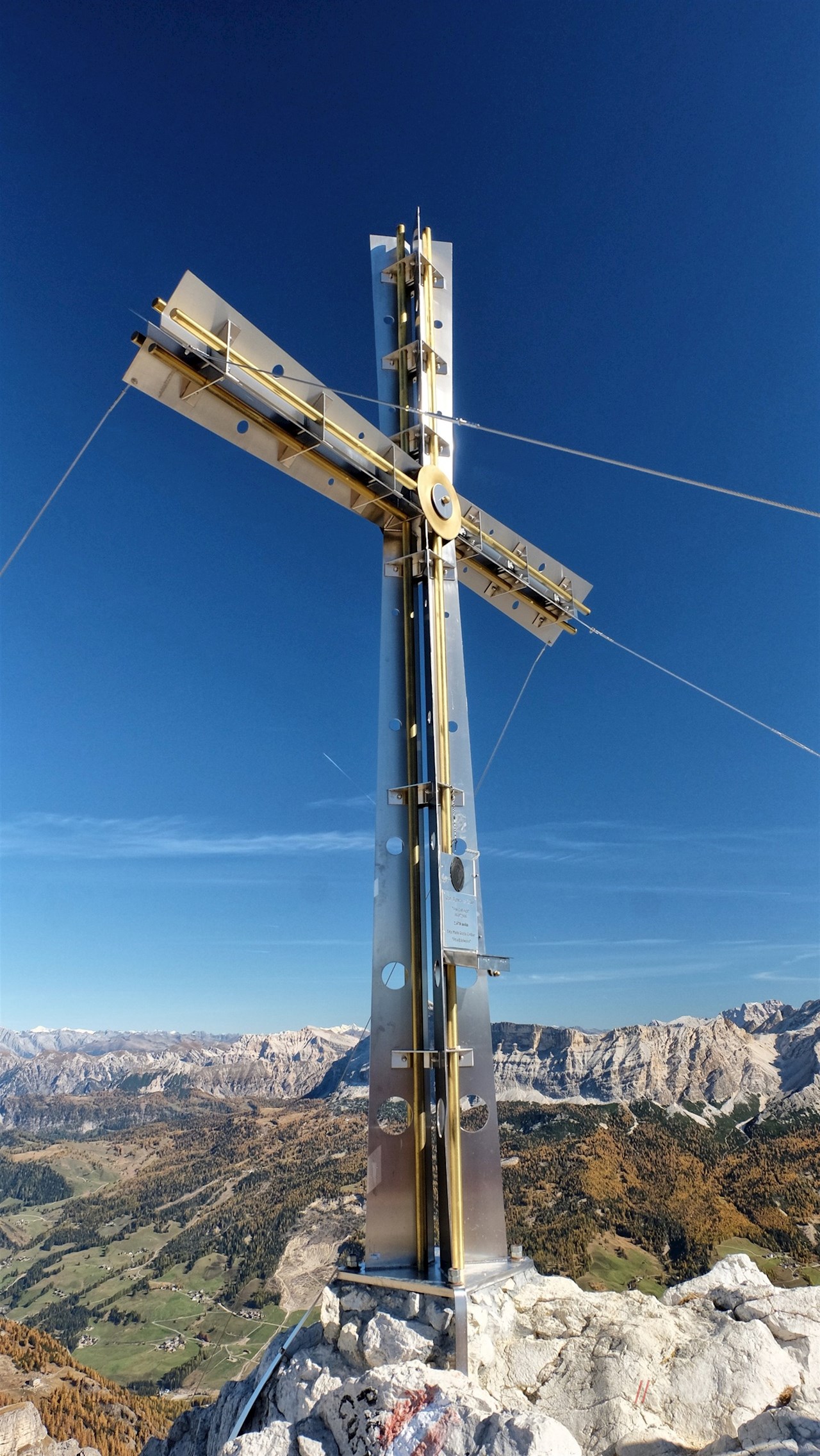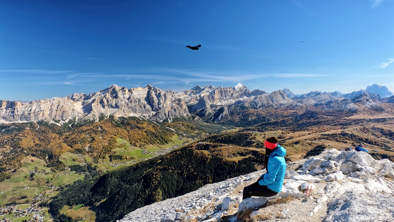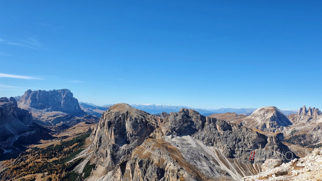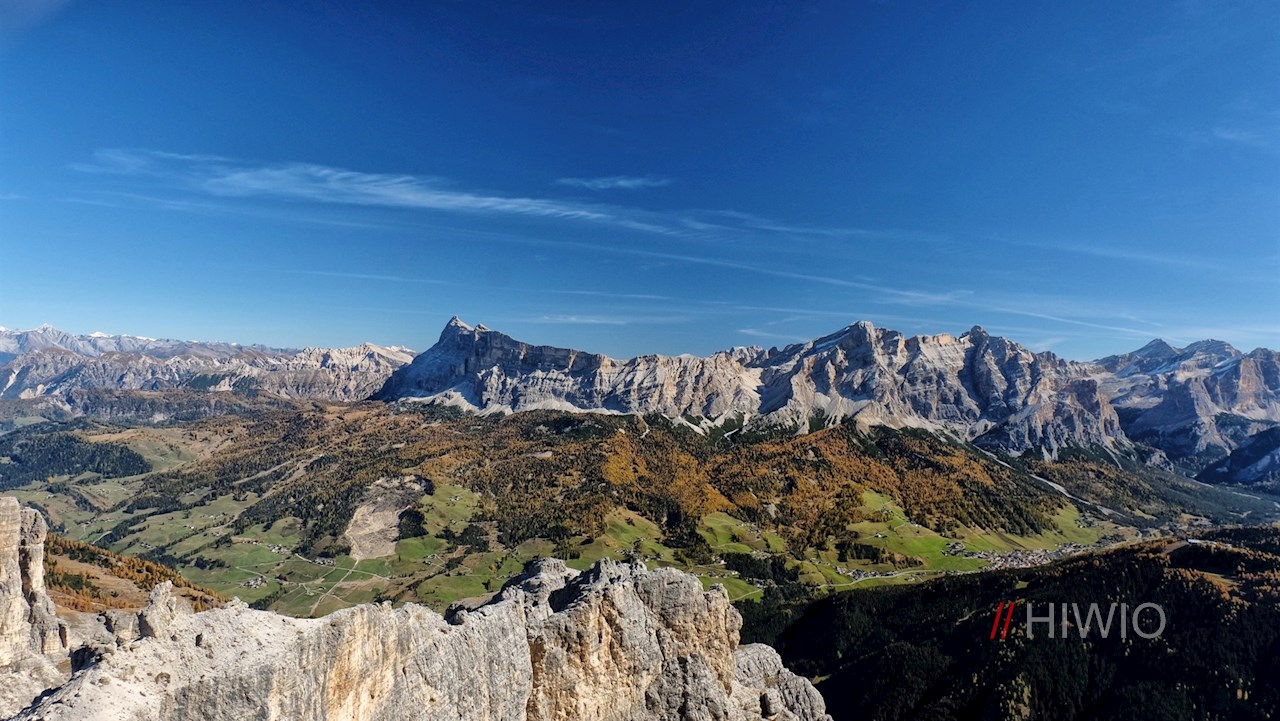 Haben sich bereits auf dem Hinweg malerische Ausblicke aufgetan, entfaltet sich neben dem eleganten Gipfelkreuz des Sassongher ein atemberaubendes Panorama: Ringsum ragen markante Dolomitengipfel wie der Heiligkreuzkofel, der Langkofel, der Sellastock, die Cirspitzen, die Puezgruppe oder die Geisler in die Höhe. Zu unseren Füßen liegen indes Kolfuschg und der beliebte Kolfuschger Höhenweg.