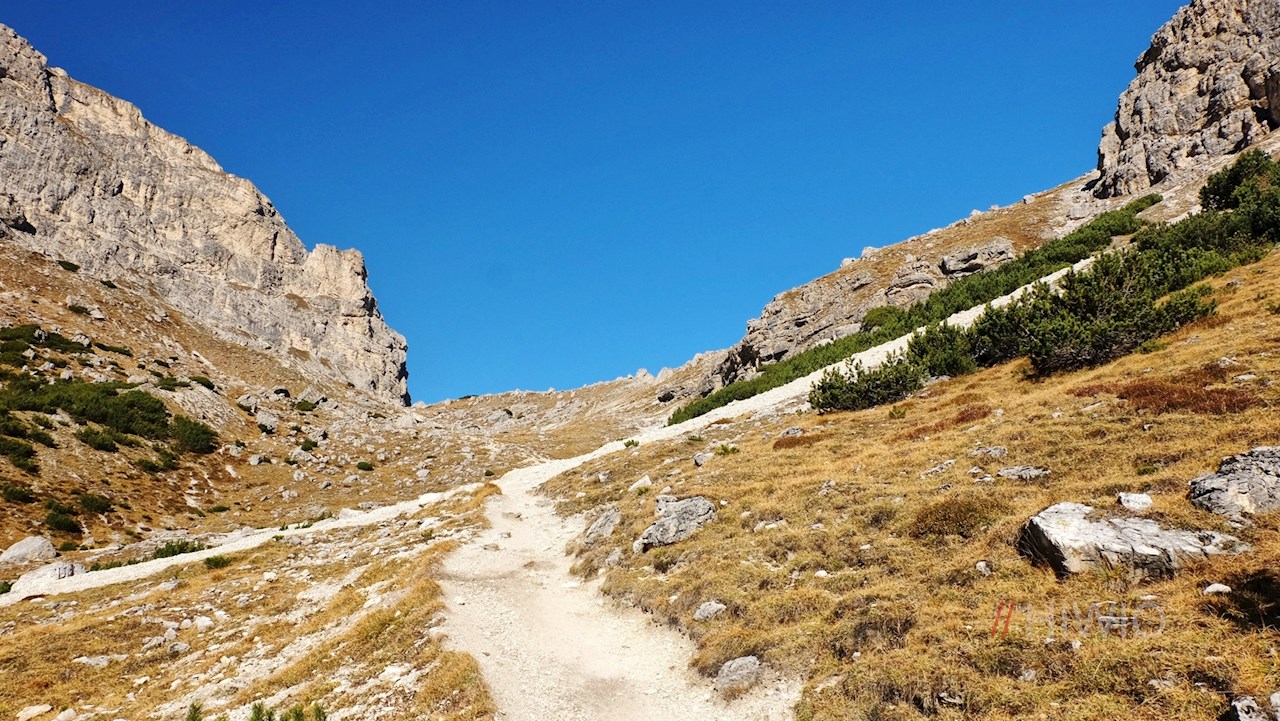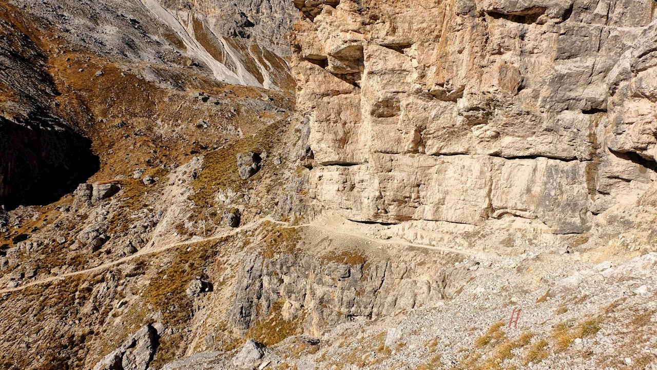Links der Hütte zweigt der nunmehr schmale, gut markierte Pfad Nr. 4 ab. Er führt über steinbeschlagene Hänge und nähert sich dabei zusehends den Felswänden des Sassongher.