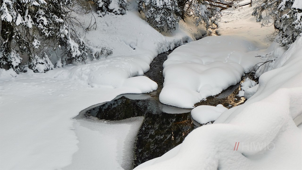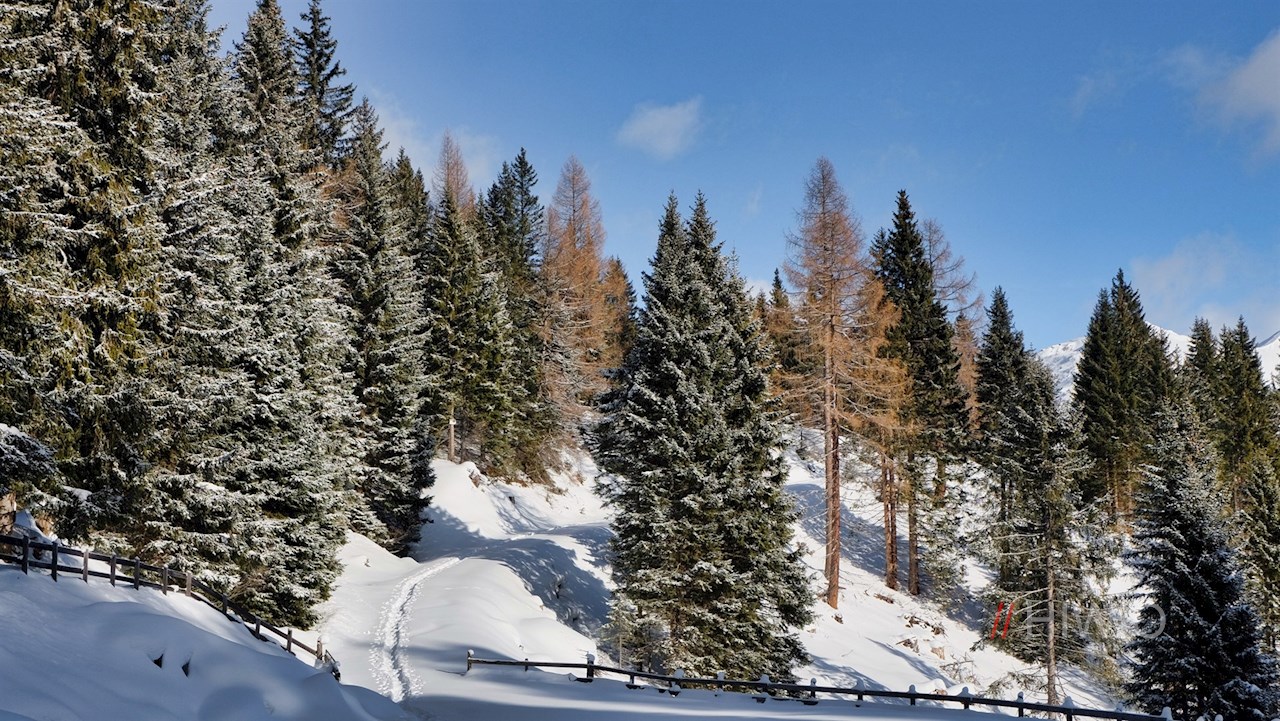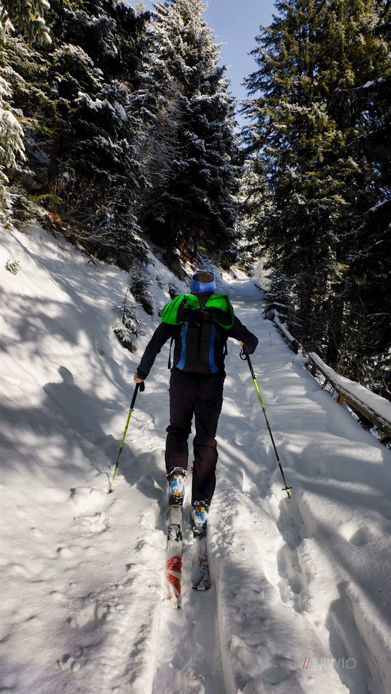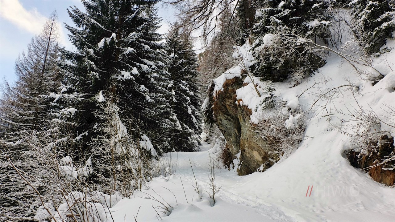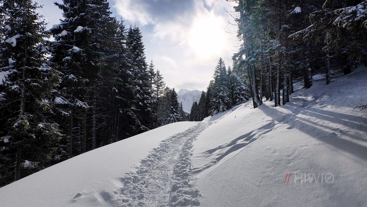 Zunächst wandert man auf dem Radweg neben der Staatsstraße ein kleines Stück südwärts, bis rechts der Waldweg Nr. 3 in Richtung Sattelbergalm abzweigt. Er führt im steten, serpentinenförmigen Anstieg durch den verschneiten Wald, der ab und an Ausblicke auf die gegenüberliegende Bergwelt freigibt. Insbesondere der markante Gipfelaufbau des Wolfendorn sticht ins Auge.