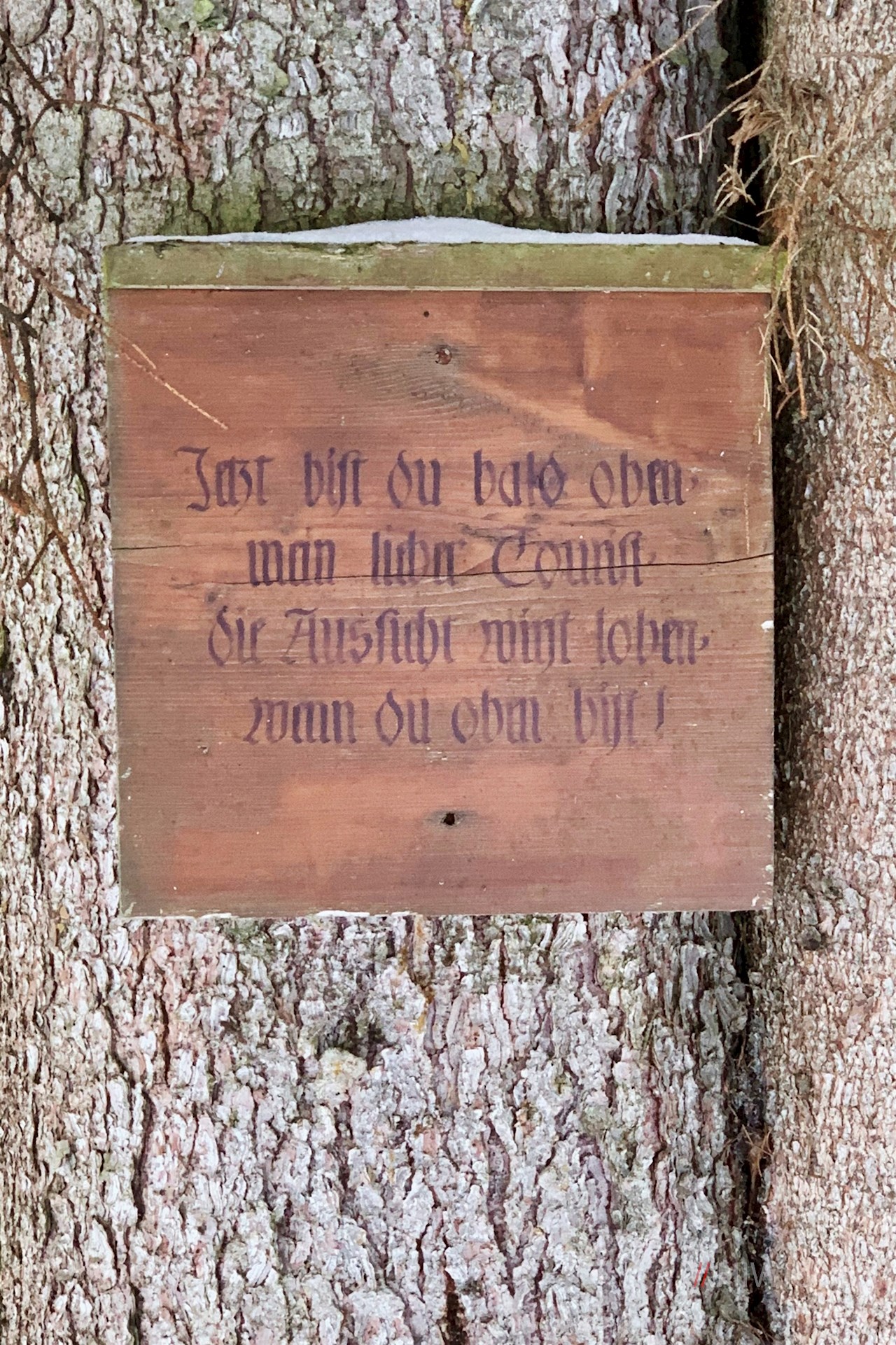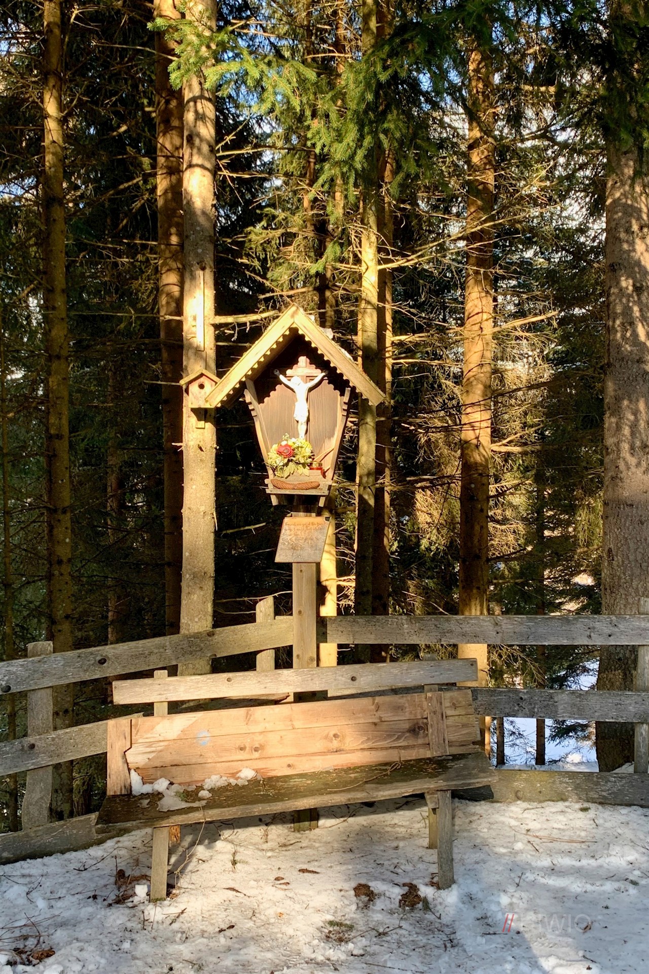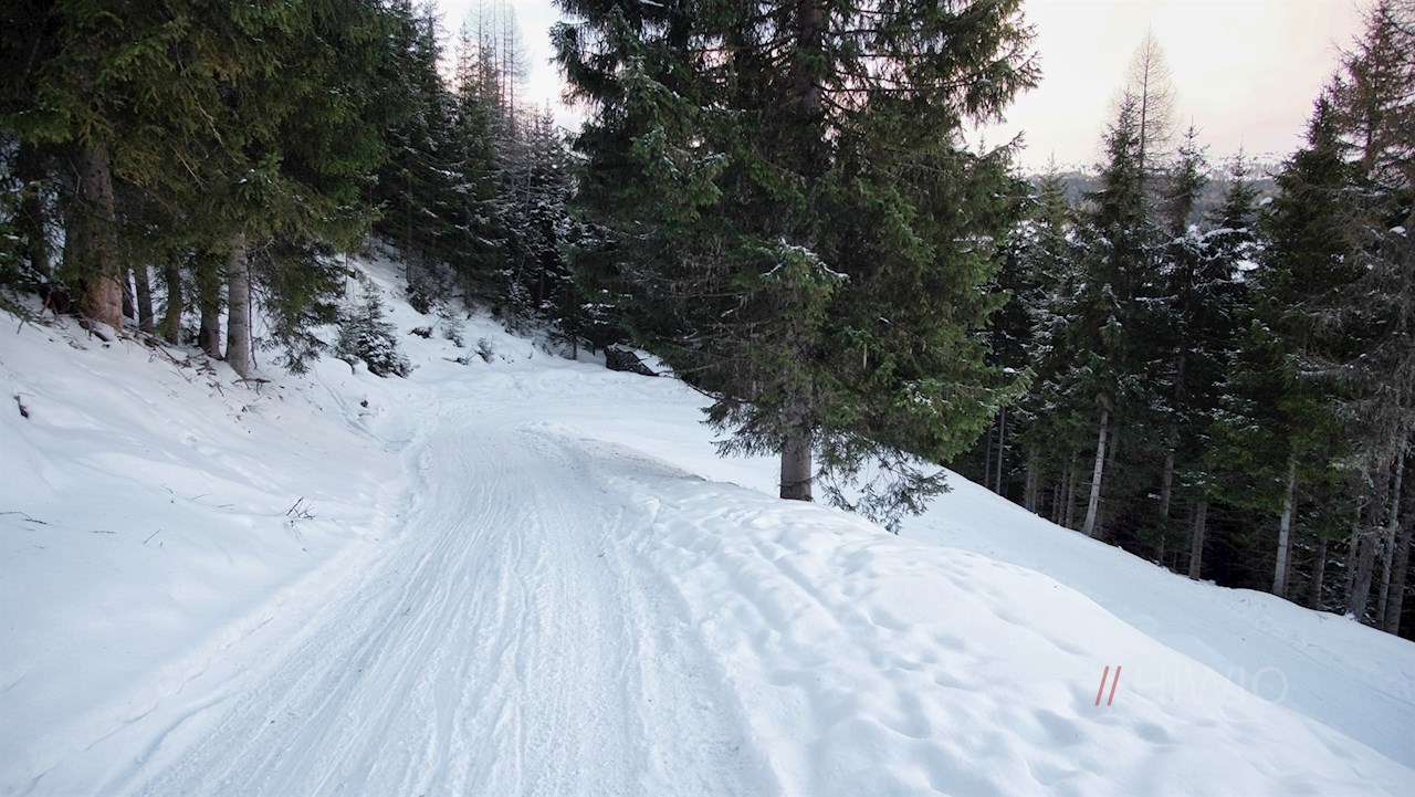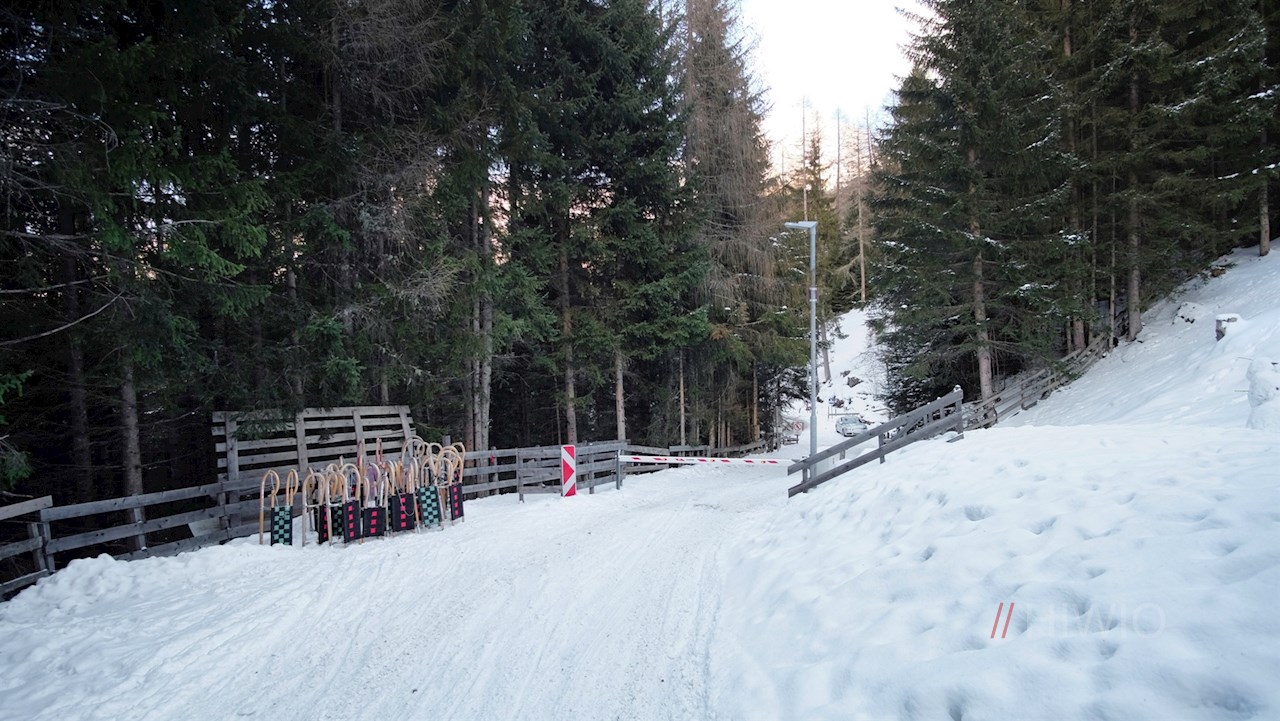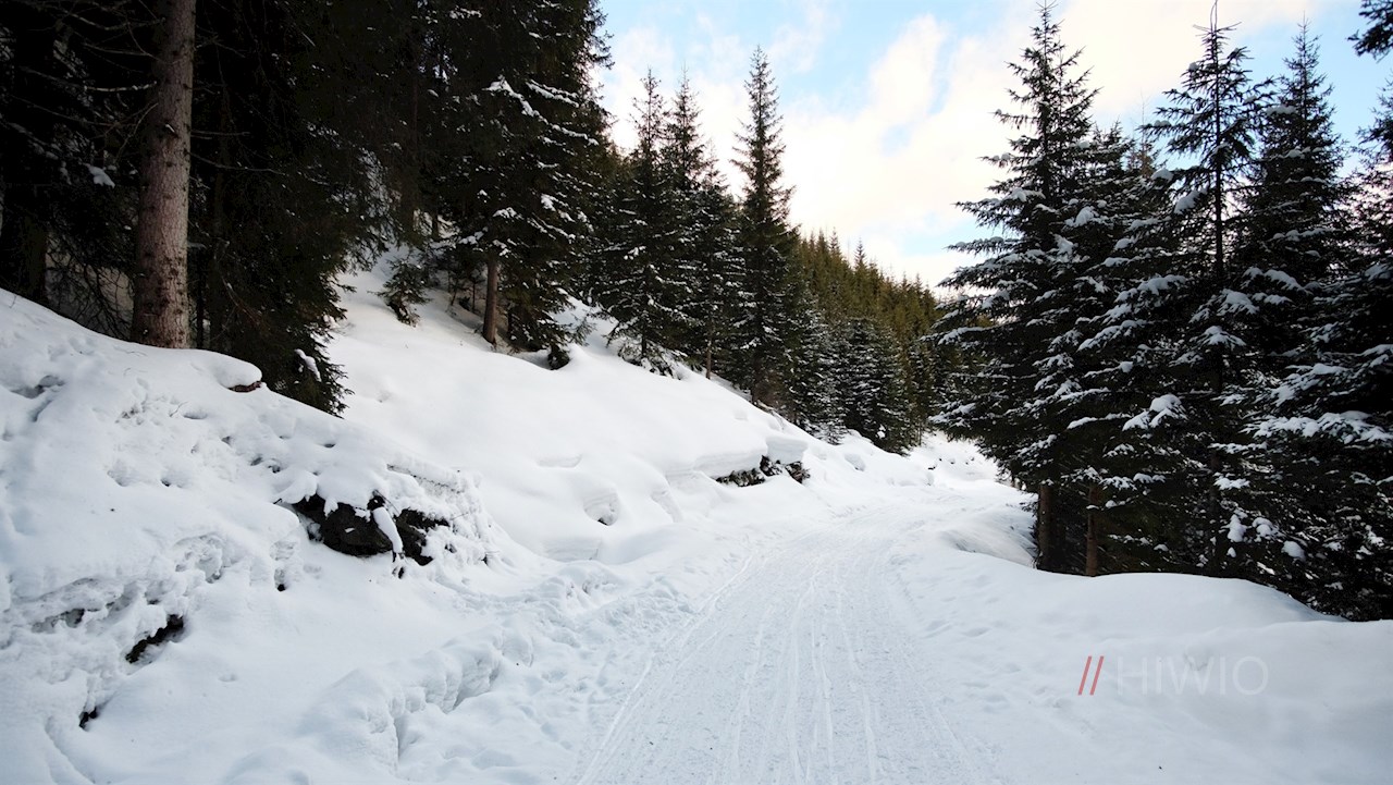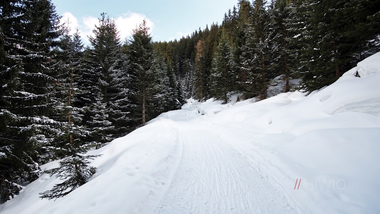 Der Beschilderung in Richtung Sattelbergalm folgend, wandert man zunächst auf der asphaltierten Höfestraße zum eigentlichen Beginn der Rodelbahn hoch. Diese führt im gleichmäßigen Anstieg durch den winterlichen Nadelwald, der hie und da verträumte Ausblicke freigibt.