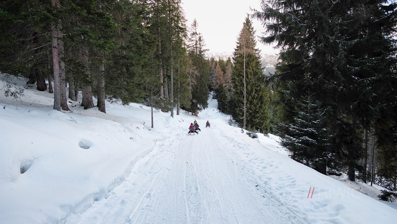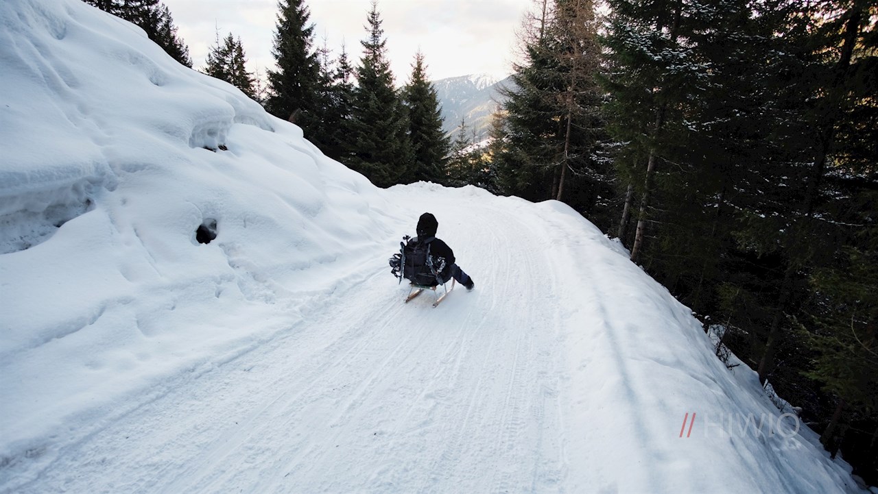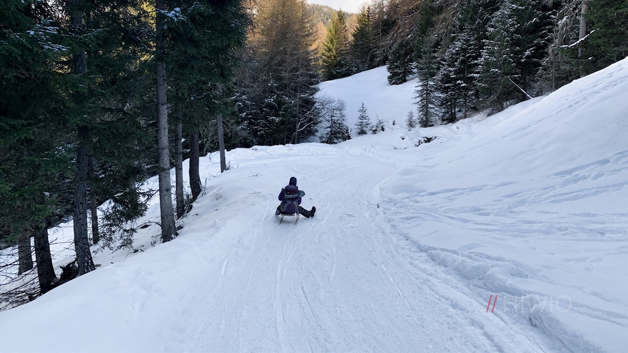 Der Rückweg von der Sattelbergalm erfolgt auf dem Hinweg. Wer möchte, kann auch in sanften Schwüngen zum Ausgangspunkt hinabrodeln. Rodeln können in der Sattelbergalm ausgeliehen werden.