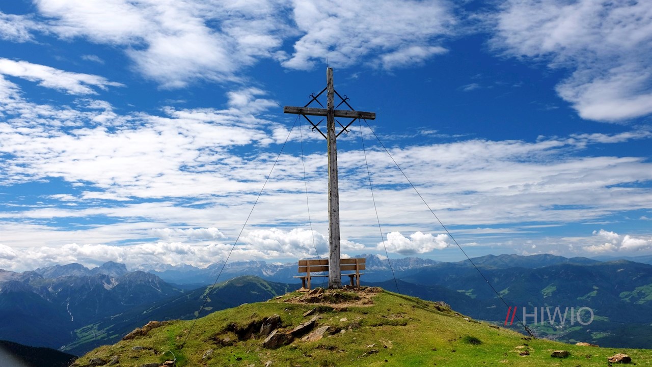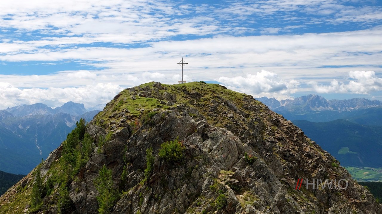 Wartet bereits der Aufstieg mit malerischen Blicken auf die umliegende Bergwelt auf, wähnt man sich auf der Aussichtsbank am Gipfelkreuz auf einem wahren Felsenthron: Ringsum erheben sich die teils vergletscherten Gipfel der Zillertaler Alpen, der nördlichen Dolomiten und der Rieserfernergruppe.