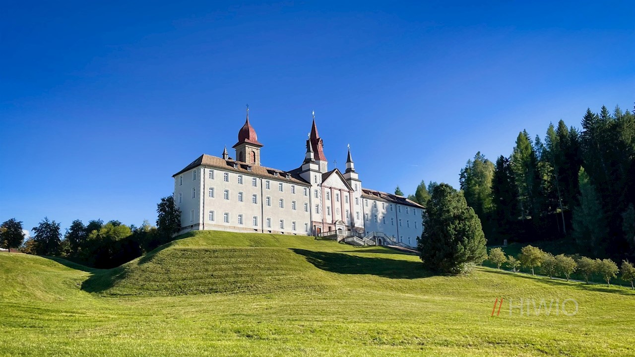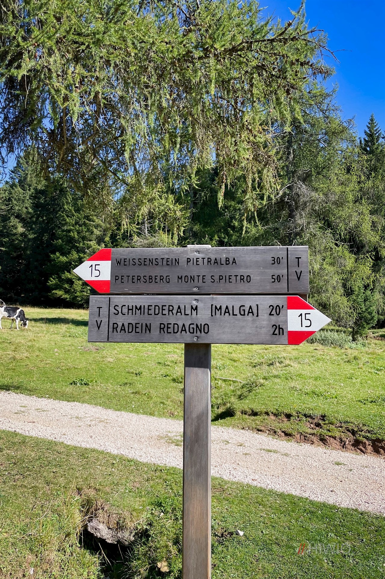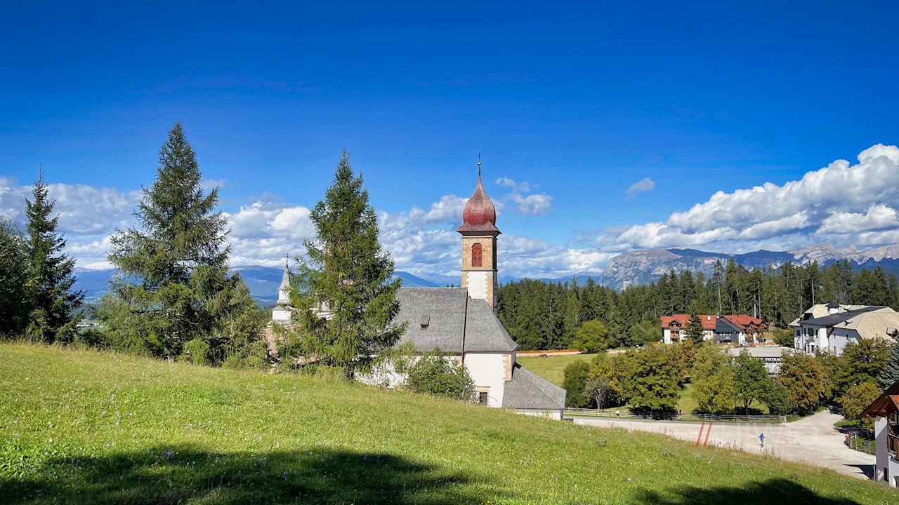 Die Wanderung zur Schönrastalm beginnt auf dem kostenpflichtigen Parkplatz des Wallfahrtsortes Maria Weißenstein bei Deutschnofen.