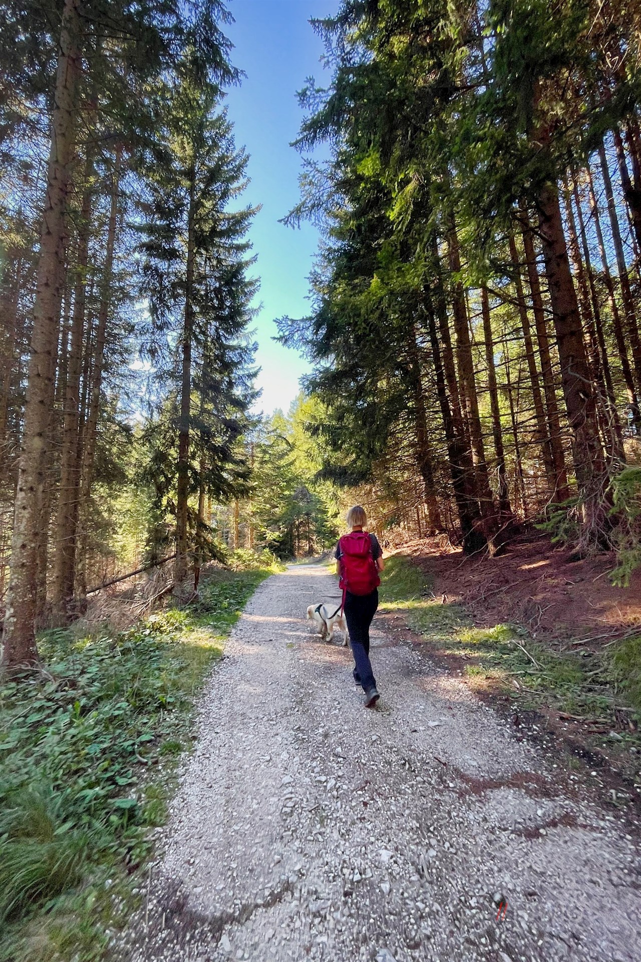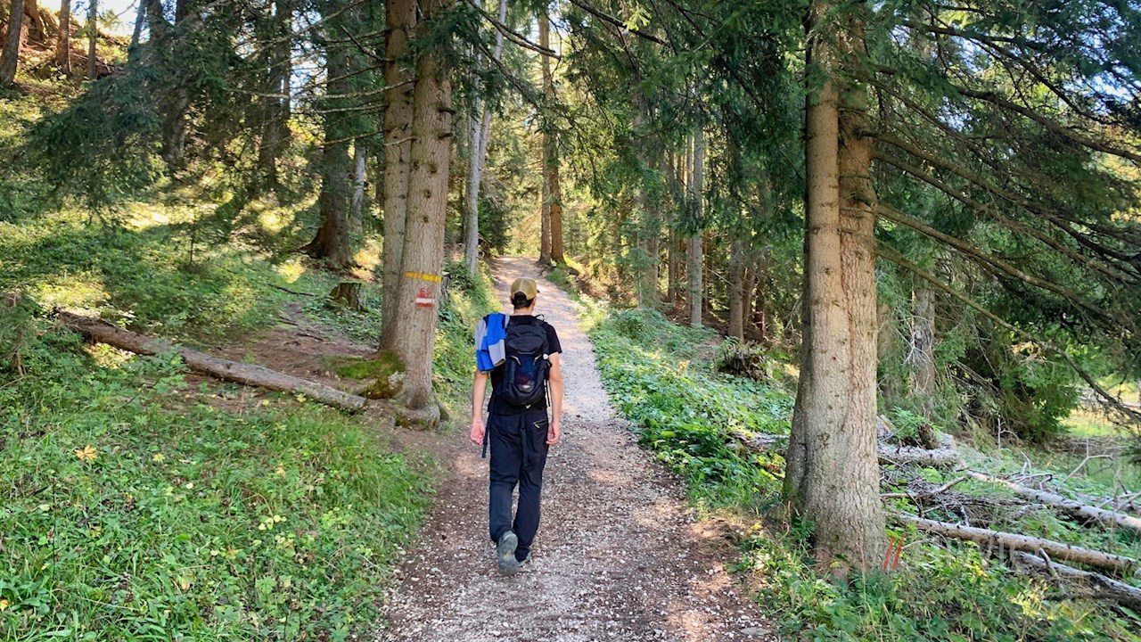Er führt zunächst im steten Anstieg durch den schattenverheißenden Wald und geht schließlich in den sanft verlaufenden Waldweg Nr. 15 über.
