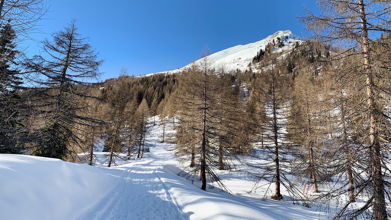 Direkt vom Parkplatz schlängelt sich der breite Wanderweg Nr. 5A im angenehmen Anstieg durch den schneeverhangenen Wald in Richtung Schönbergalm. Unterwegs öffnen sich ab und an verträumte Ausblicke.