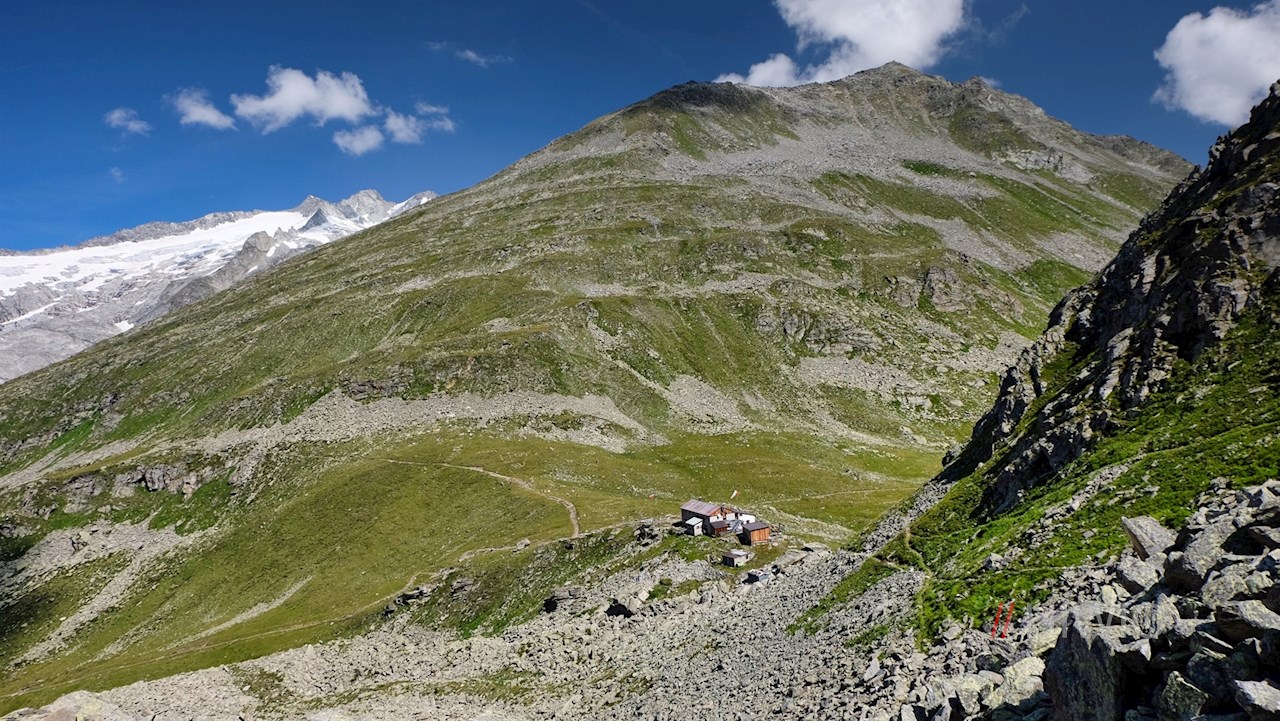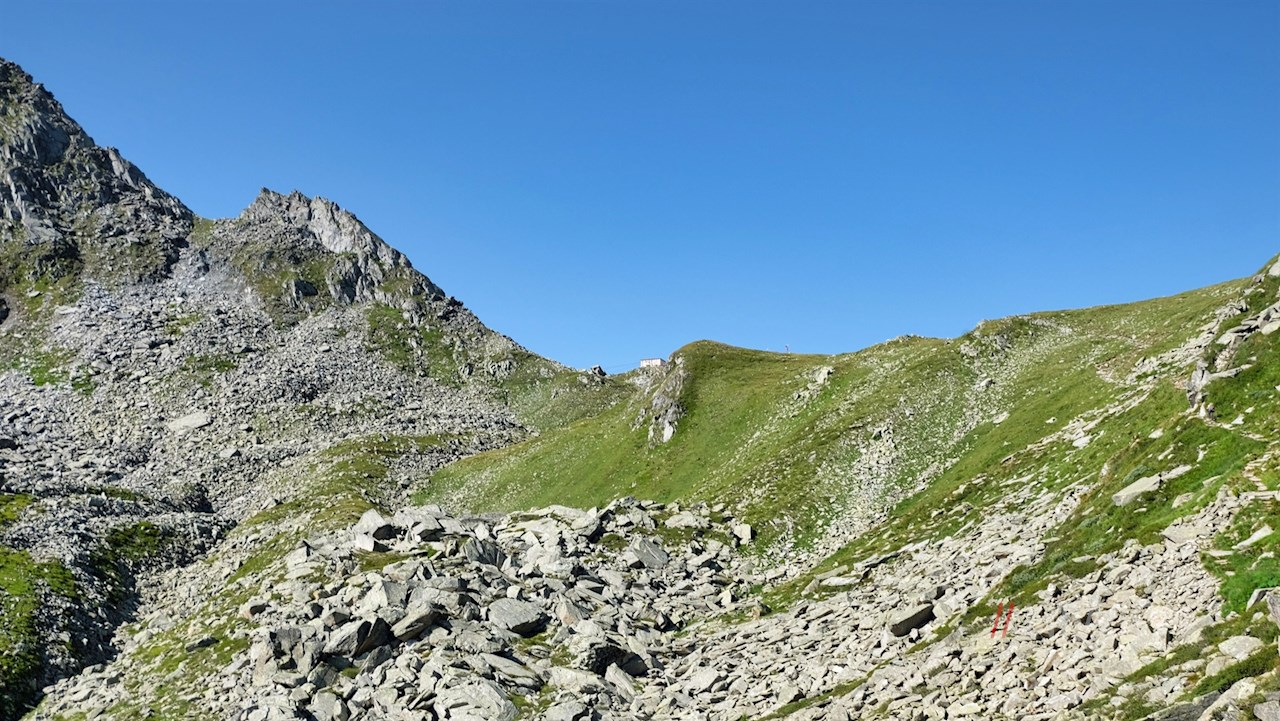 Hinter der Göge Alm geht der bislang breite Wanderweg in den schön angelegten Pfad Nr. 24 über. Er steigt durch die steinbeschlagenen Bergwiesen auf das aussichtsreiche Nevesjoch und zur auf ihm thronenden Chemnitzer Hütte an. Mit Blick auf die vergletscherten Felswände des Hohen Weißzint lädt sie auf 2.419 m Höhe zur erneuten Zwischenrast.