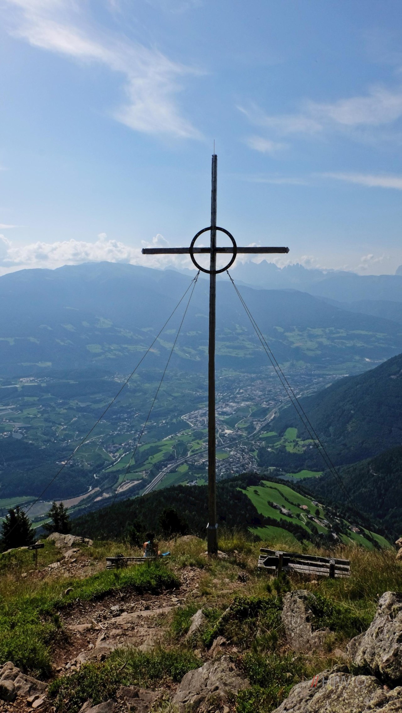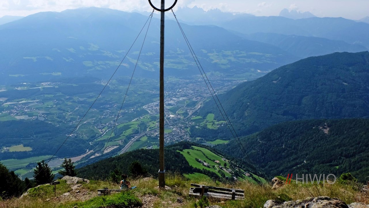Nach etwa eineinhalb Stunden steten Anstiegs tritt man aus dem Wald heraus und erblickt auch schon das Gipfelkreuz des aussichtsreichen Scheibenberges. Auf 1.925 m Höhe liegt einem hier die Bischofsstadt Brixen wortwörtlich zu Füßen und auch die Silhouetten der weltbekannten Dolomiten lassen sich in der Ferne ausmachen.