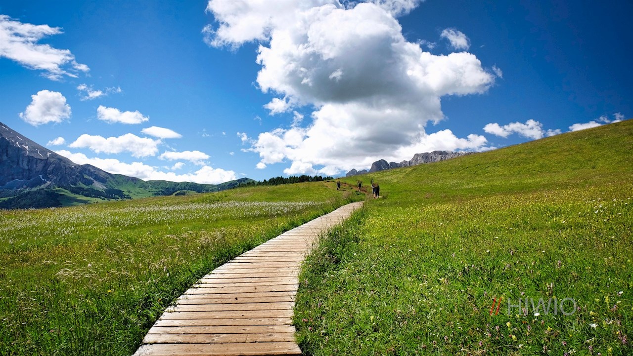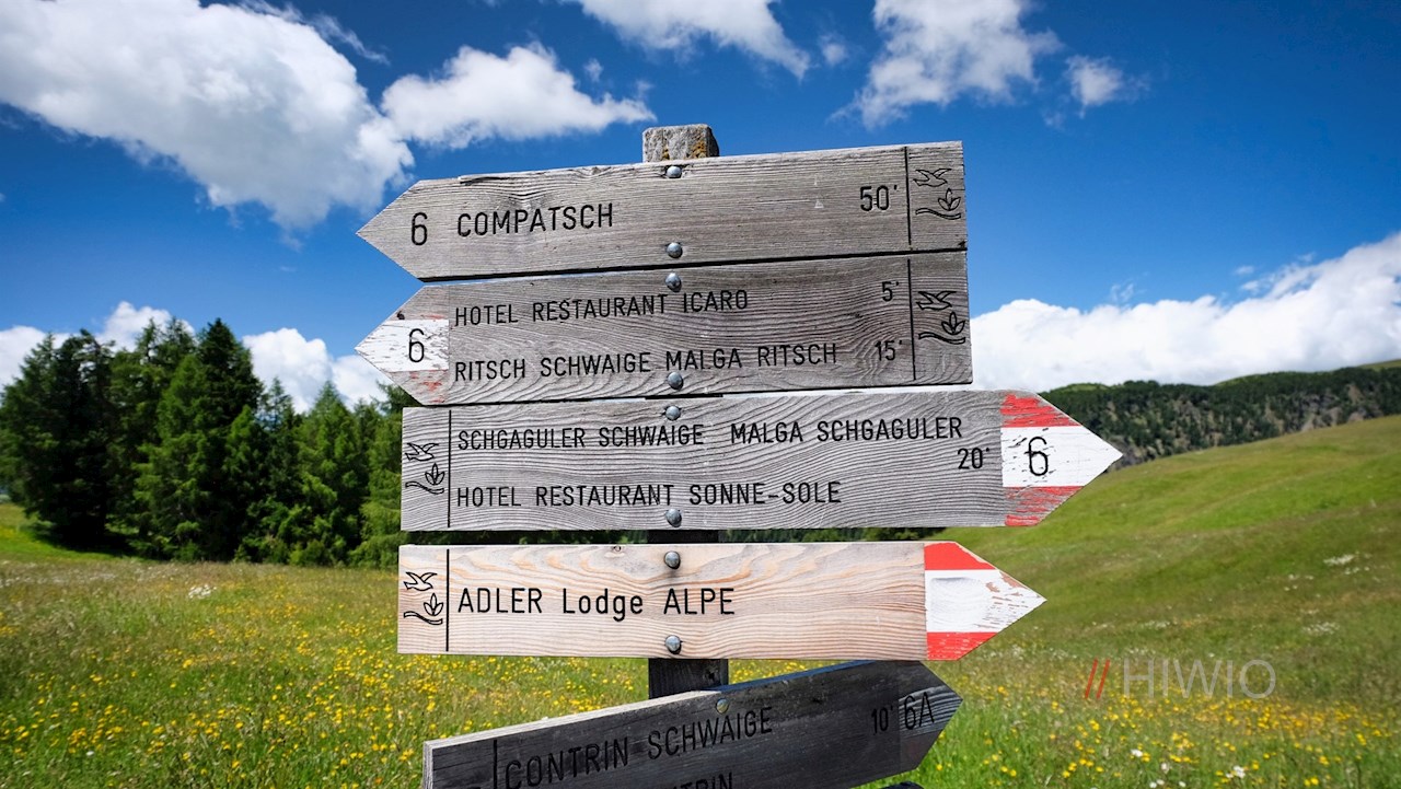 Von Compatsch zieht sich der breite Wanderweg Nr. 30 durch die sanft gewellten Almwiesen, die sich im Frühsommer in ein leuchtendes Blütenmeer aus Blumen und Kräutern verwandeln. In ihnen gedeihen unter anderem das artenreiche Habichtskraut, das zarte Knabenkraut oder die schmerzlindernde Arnika.