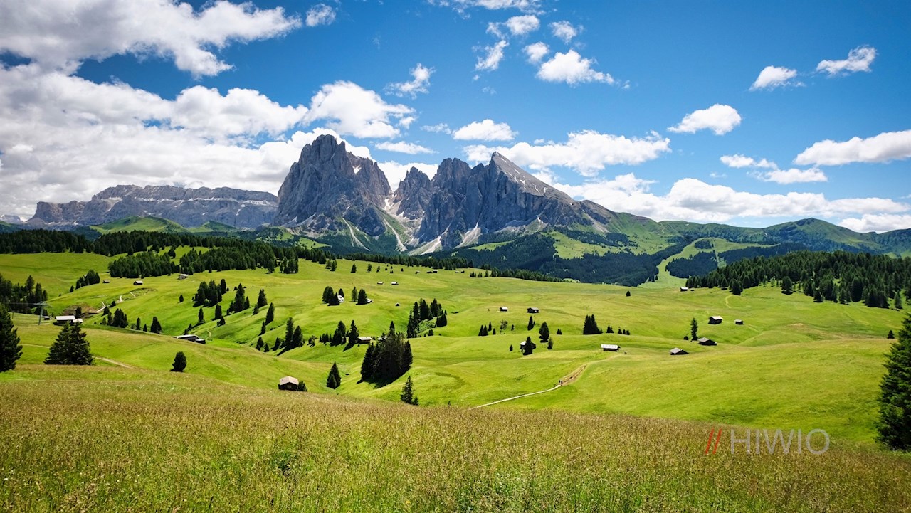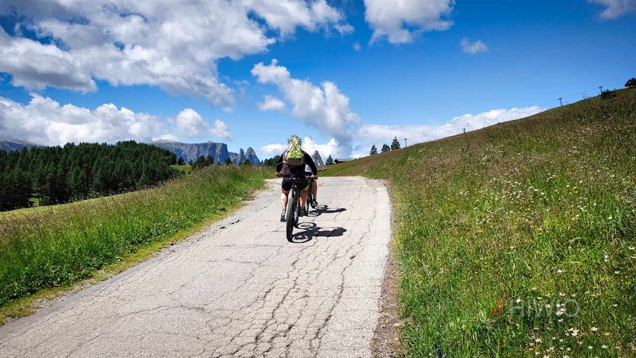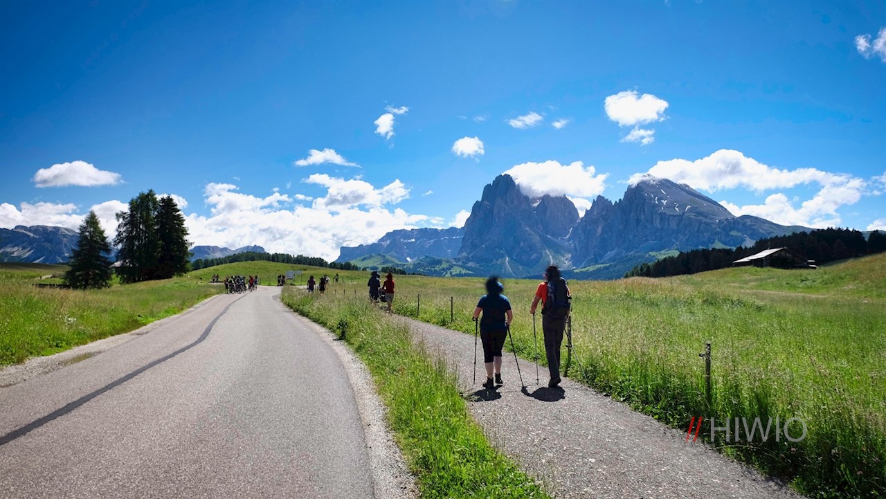 An der nächsten Weggabelung folgt man dem Weg Nr. 3 in Richtung Sanon Hütte, von dem wenig später der asphaltierte Wanderweg Nr. 6 zur Schgaguler Schwaige abzweigt. Er schlängelt sich im leichten Auf und Ab durch die weitläufigen Almwiesen und öffnet dabei schöne Ausblicke auf die nahen Dolomitengipfel mit der alles beherrschenden Langkofelgruppe.