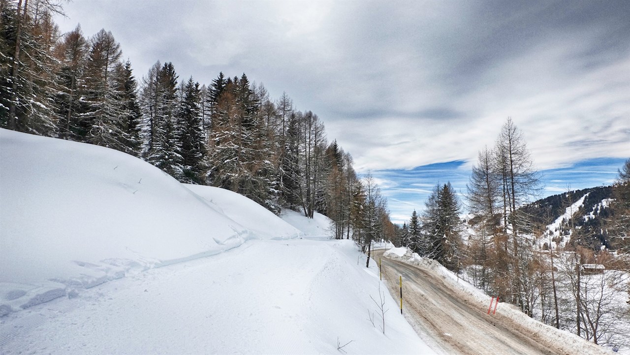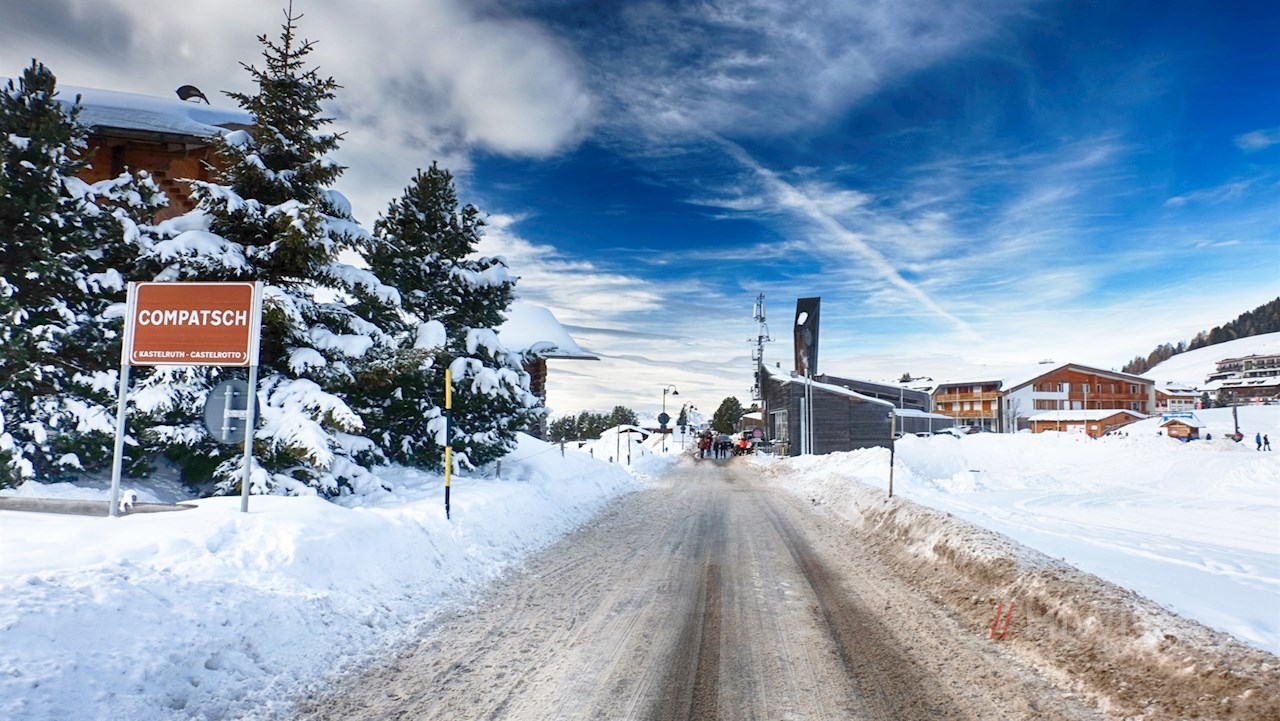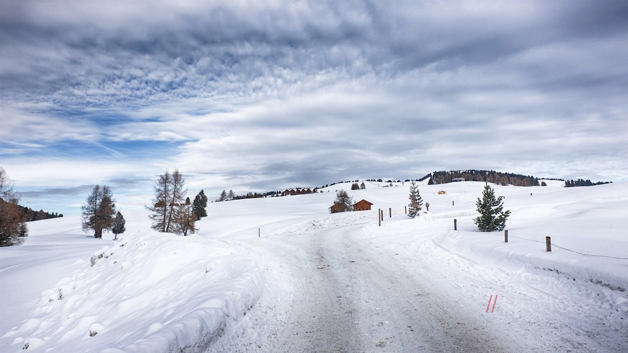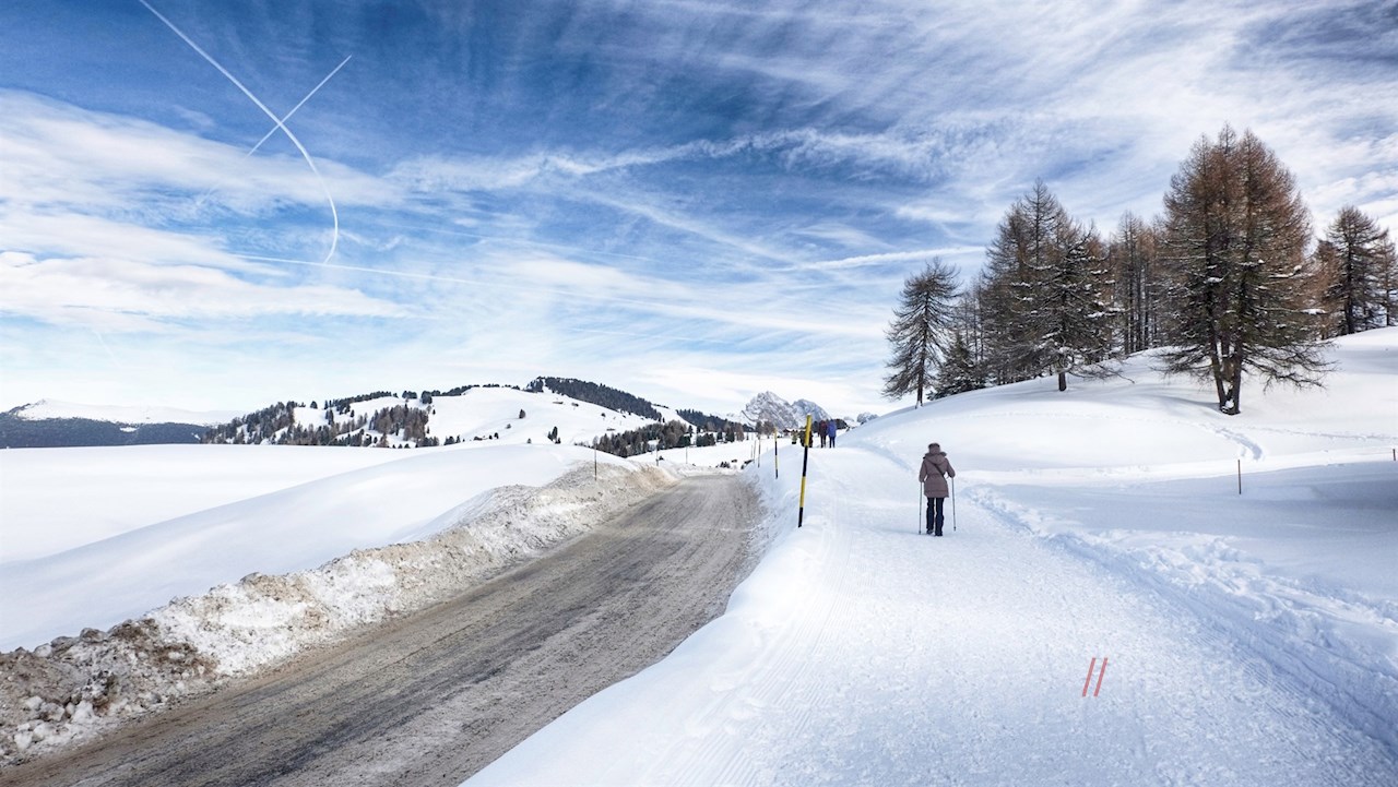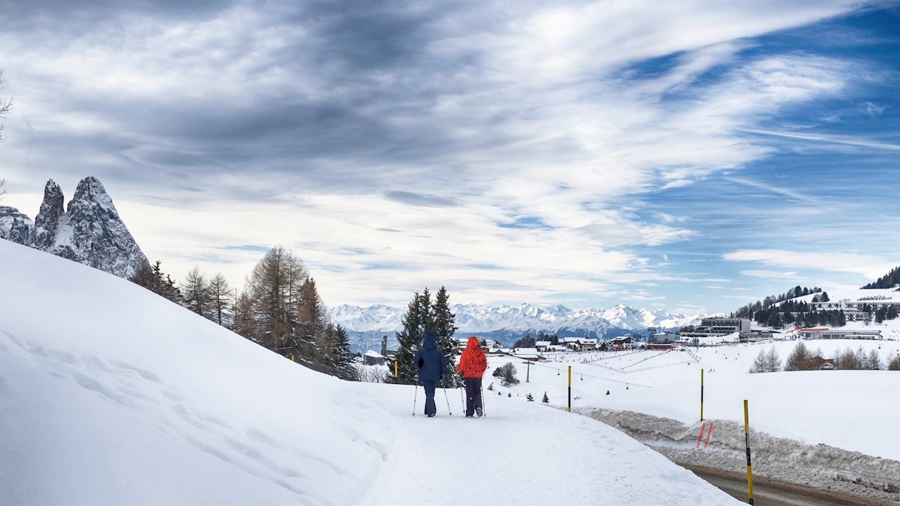 Kurz vor dem Gasthof Ritsch zweigt am linken Wegesrand der breite Weg Nr. 6 ab. Er führt vor der malerischen Kulisse der Villnösser Geisler, der Seceda und des Langkofelmassivs durch die sanft gewellten Almwiesen, die im Winter unter einer glitzernden Schneedecke ruhen.