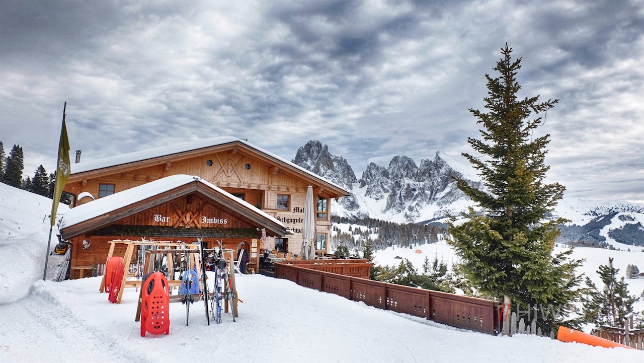 In der Schgaguler Schwaige werden auch im Winter Träume wahr: Nach einer schönen Wanderung durch die verschneiten Almwiesen der Seiser Alm lädt die beliebte Hütte vor der malerischen Kulisse der gegenüberliegenden Dolomiten zur genüsslichen Einkehr.
