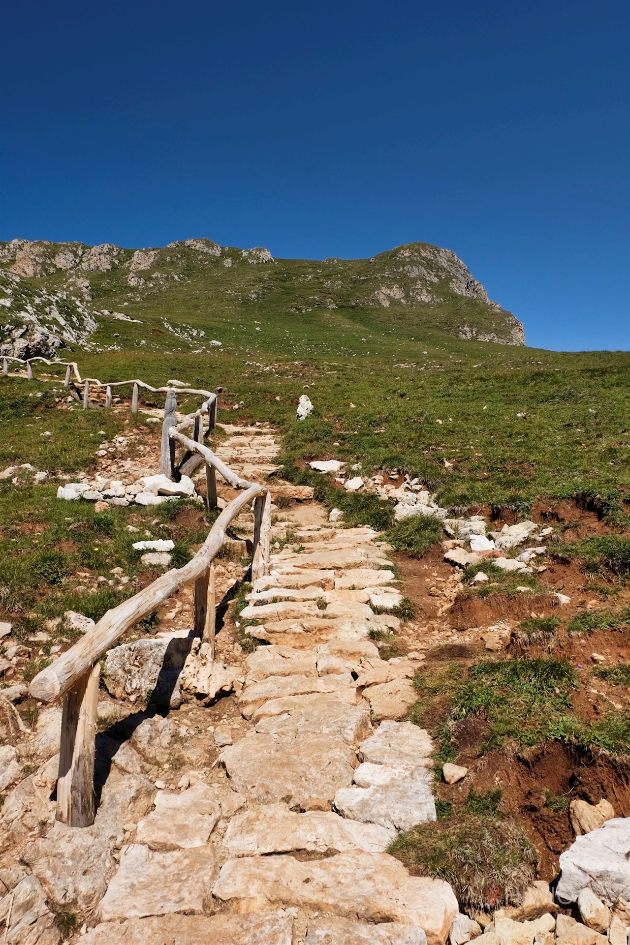 Von der Prossliner Schwaige führt der nunmehr schmale Pfad im sanften Auf und Ab durch eine Mulde, hinter der er in den mit der Wegnummer 1 ausgeschilderten Touristensteig mündet. Dieser führt im steten Anstieg über den latschen-, blumen- und grasbewachsenen Osthang des Schlern zum gleichnamigen Schutzhaus auf 2.457 m Höhe.