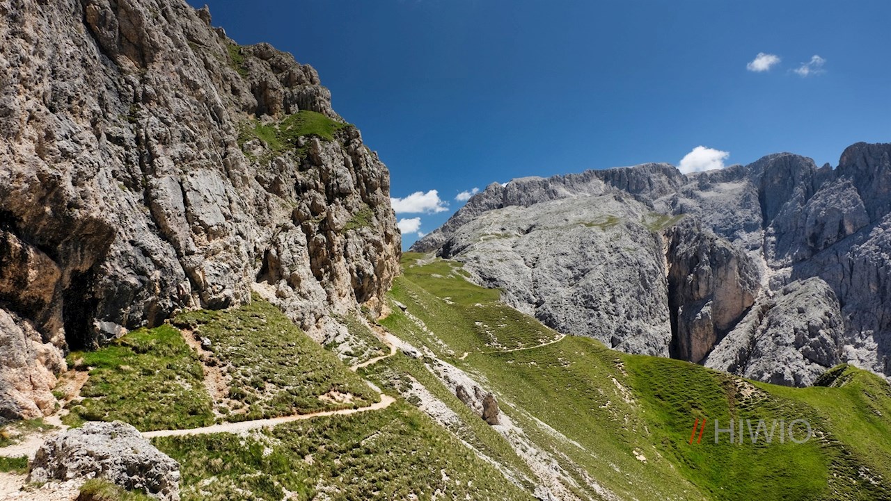 Vom Tierser Alpl führt der Pfad Nr. 2 im leichten, etwa 10-minütigen Anstieg auf die Rosszahnscharte und fällt dann serpentinenförmig durch die steile, geröllbeladene Rosszahnscharte ab.