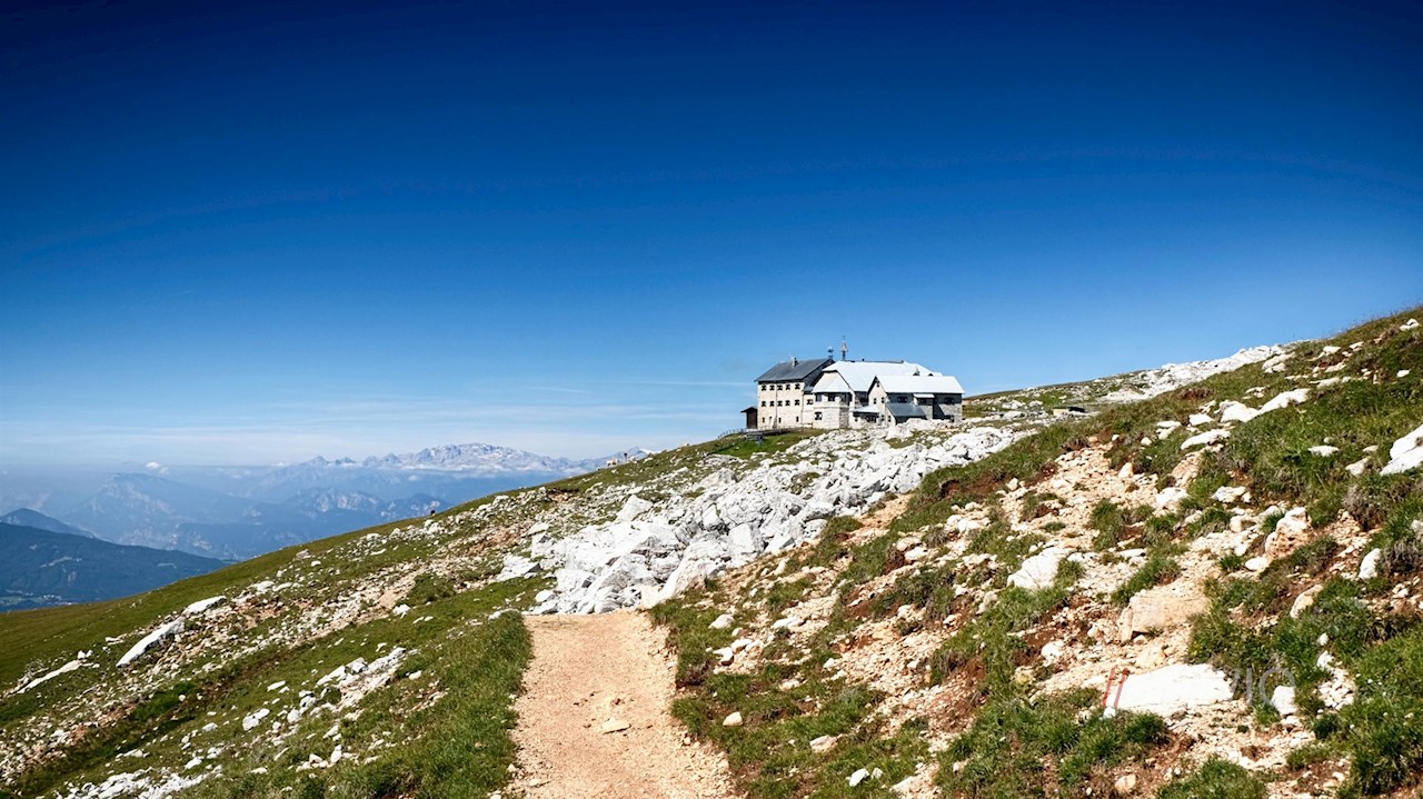 Über den teils latschen-, teils blumen- und grasbewachsenen Osthang des Schlern gelangt man so zur Schlernhochfläche und dem gleichnamigen Schutzhaus auf 2.457 m Höhe.