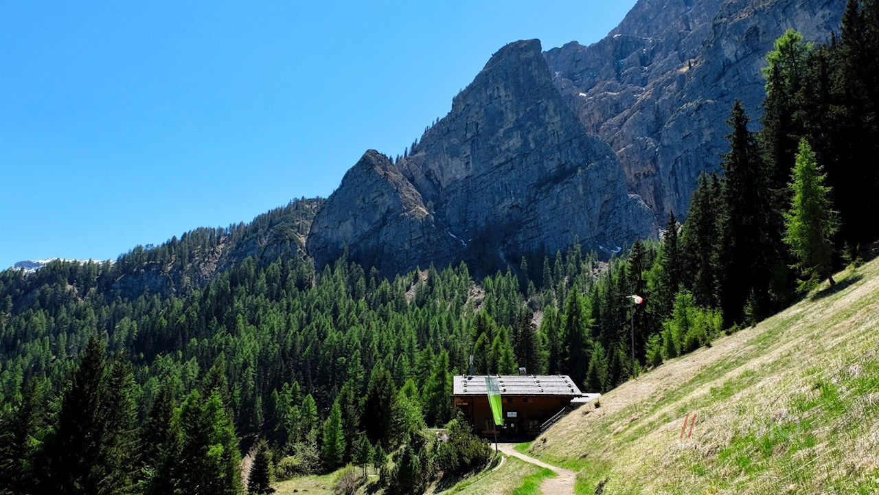 Nach insgesamt etwa zwei Stunden steten Wanderns erreicht man die Schlernbödelehütte. Inmitten einer aussichtsreichen Waldlichtung lädt sie zu Füßen des Schlern zur genüsslichen Einkehr. Die Kapelle hinter der Almhütte gedenkt übrigens jener Bergsteiger, die seit 1894 im Schlerngebiet ihr Leben ließen.