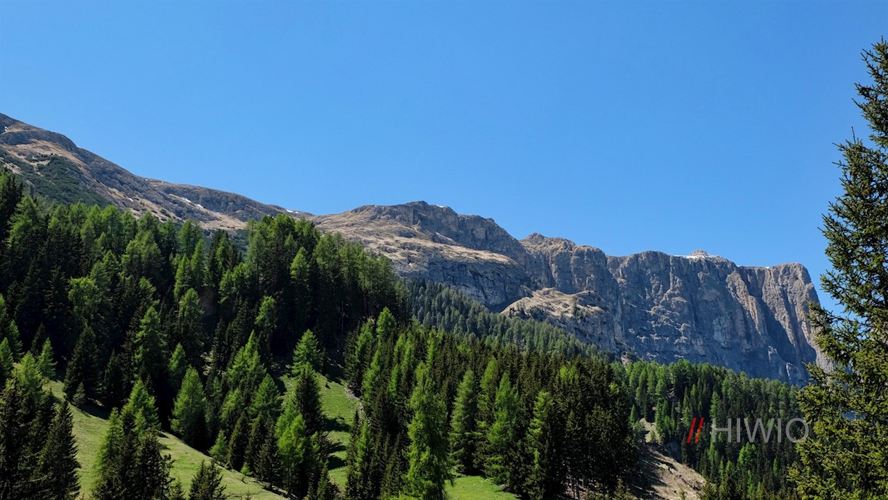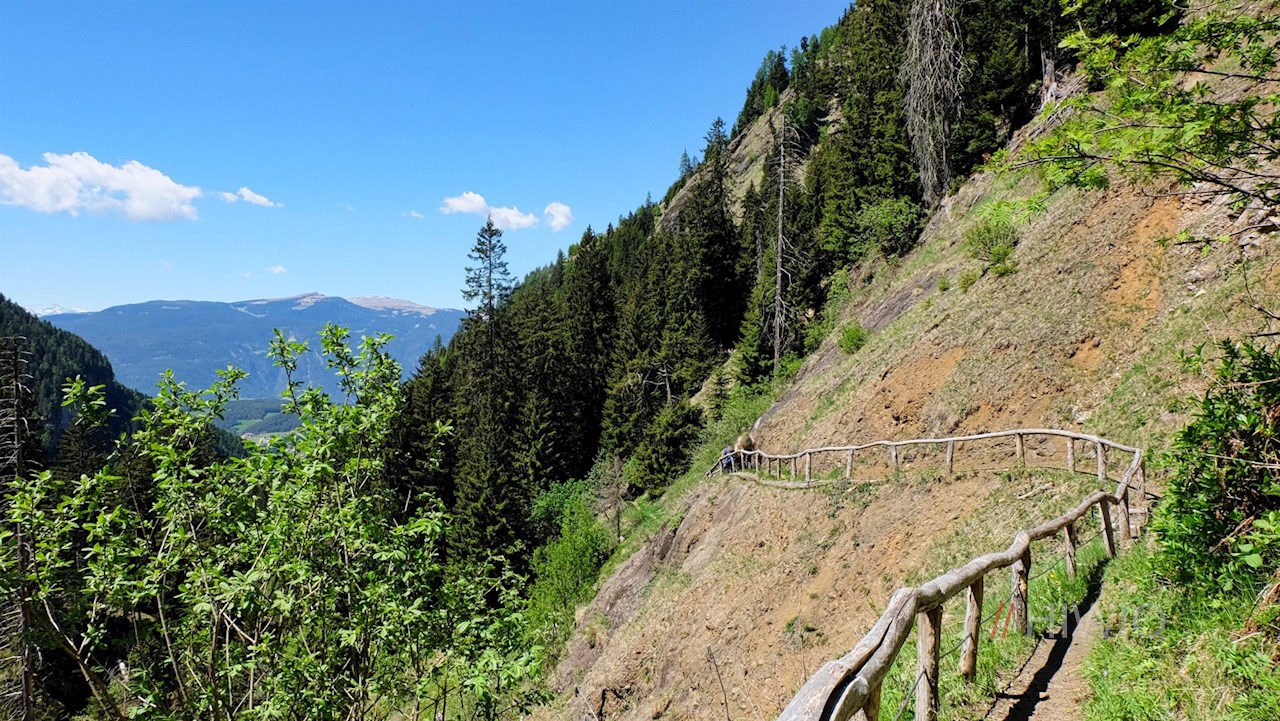 Hinter der Schlernbödelehütte quert der nahezu ebene Wanderweg Nr. 1 die großenteils bewaldeten Steilhänge in Richtung Prossliner Schwaige.