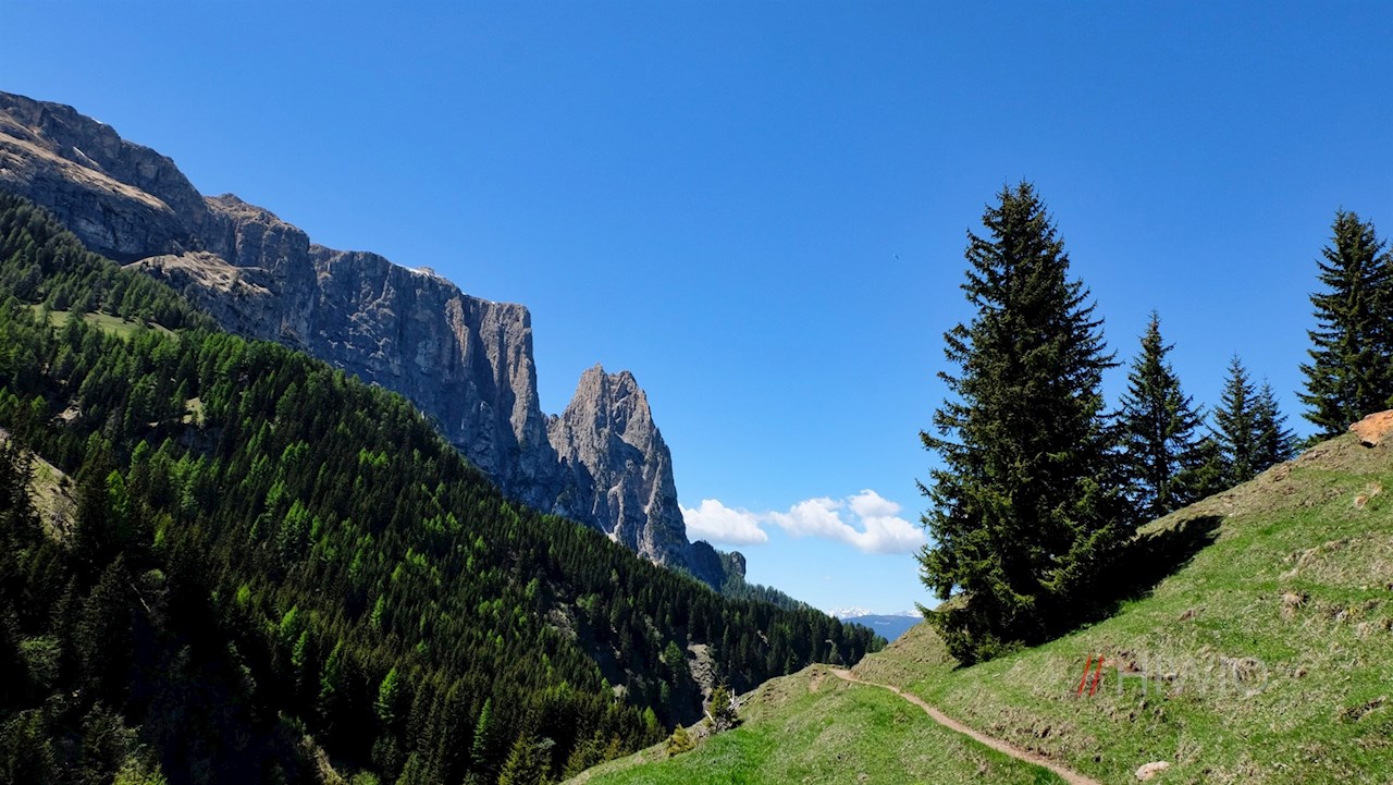 Nahe Bad Ratzes zweigt der nunmehr schmale Steig Nr. 1 in Richtung Schlernbödelehütte ab. Er windet sich im steten, bisweilen recht steilen Anstieg serpentinenförmig durch einen friedvollen Wald, der immer wieder Blicke auf die imposanten Felswände des Schlernmassivs freigibt.