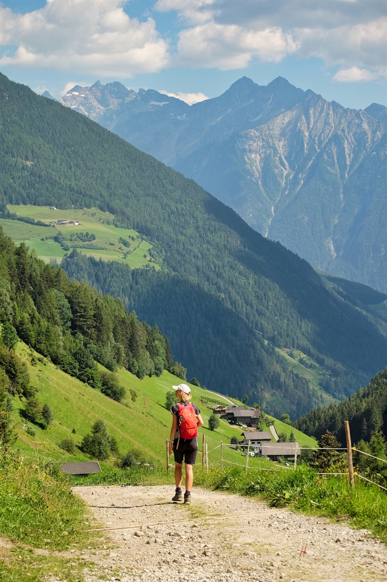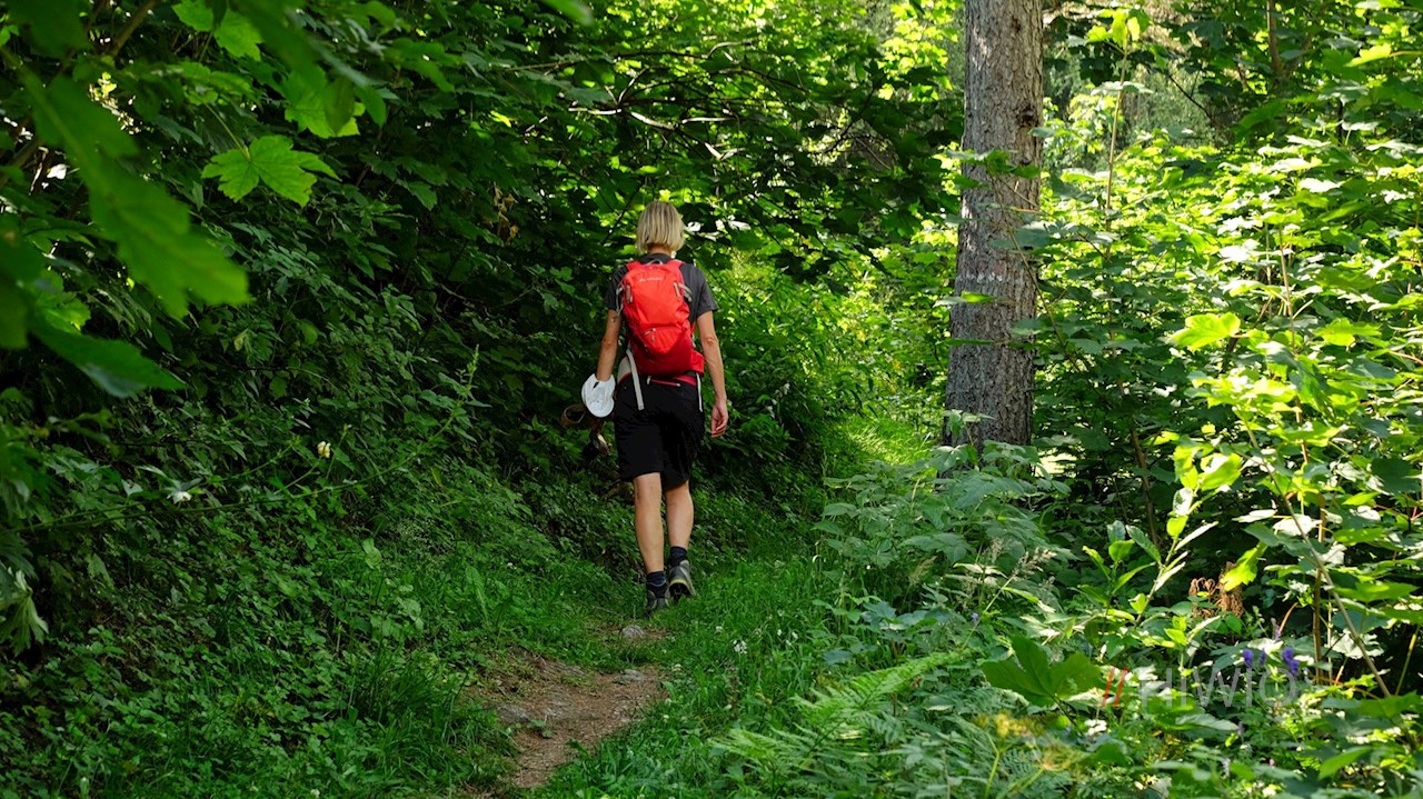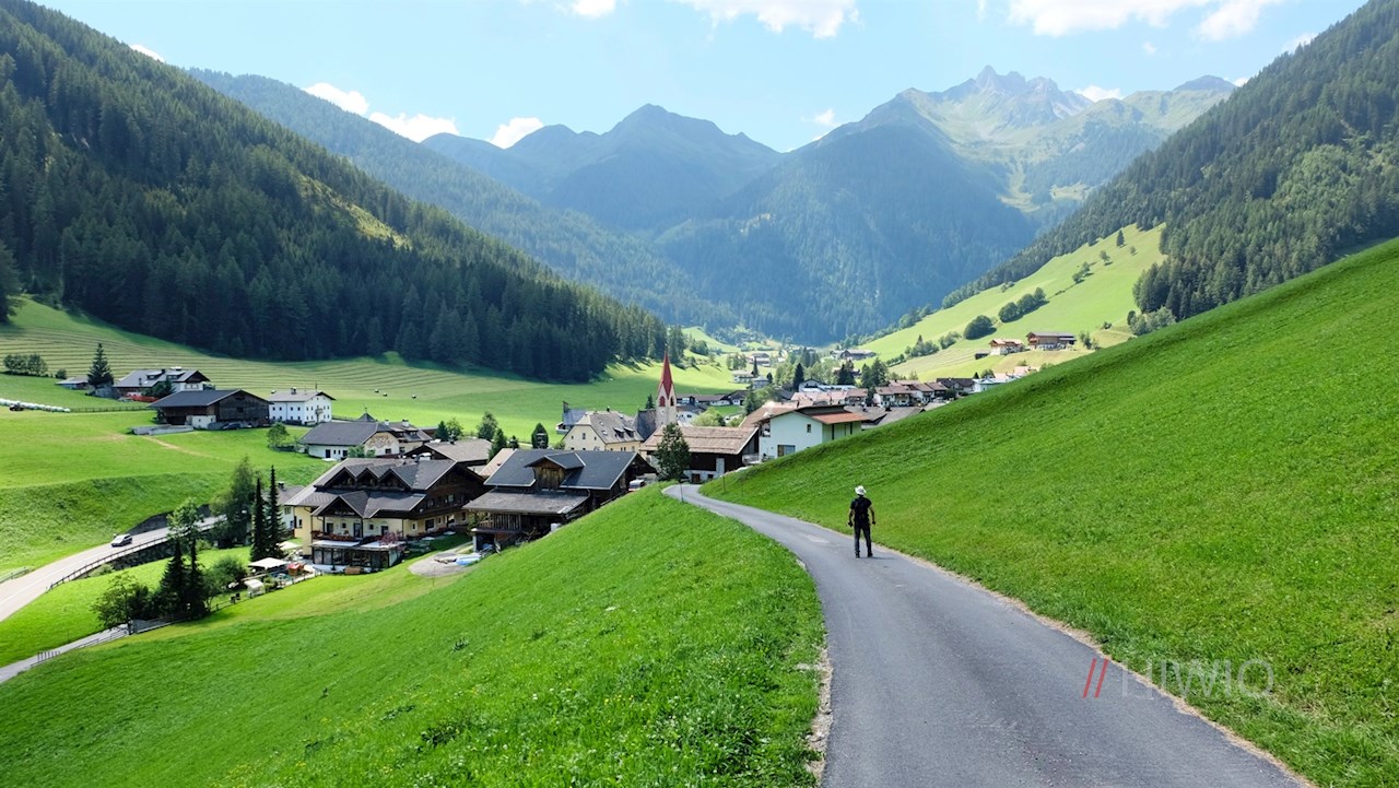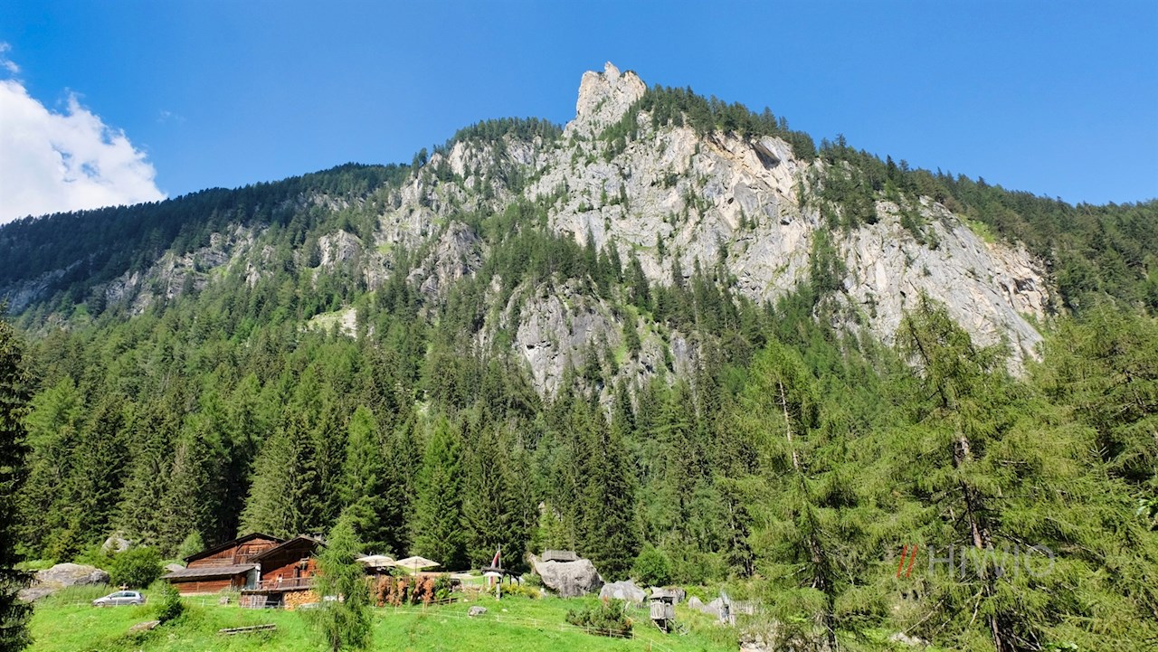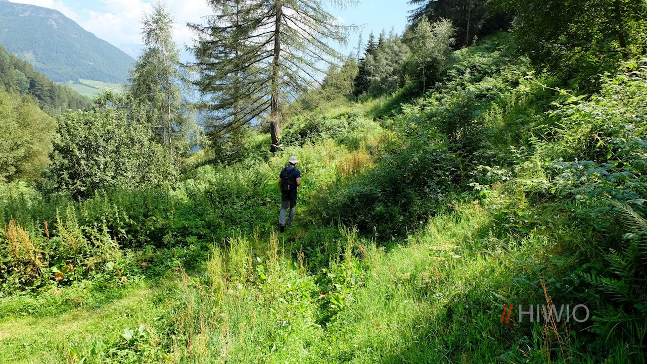 Er führt im angenehmen Auf und Ab an den Eggerhöfen vorbei und öffnet dabei schöne Ausblicke auf das tiefer liegende Luttach, die gegenüberliegende Buseggealm und den über uns aufragenden Schönberg.