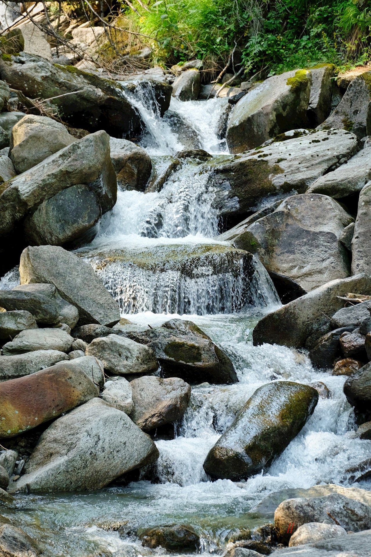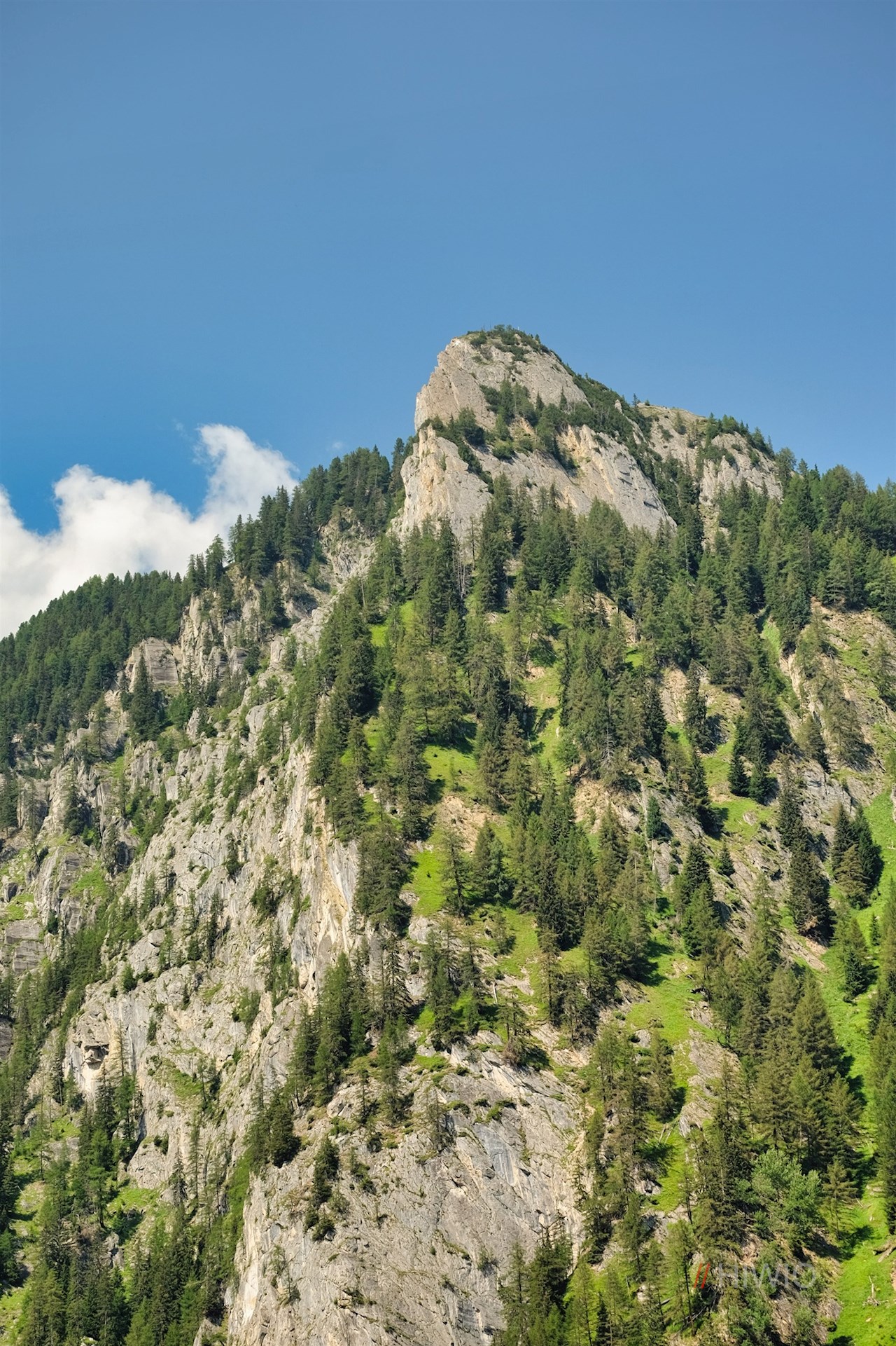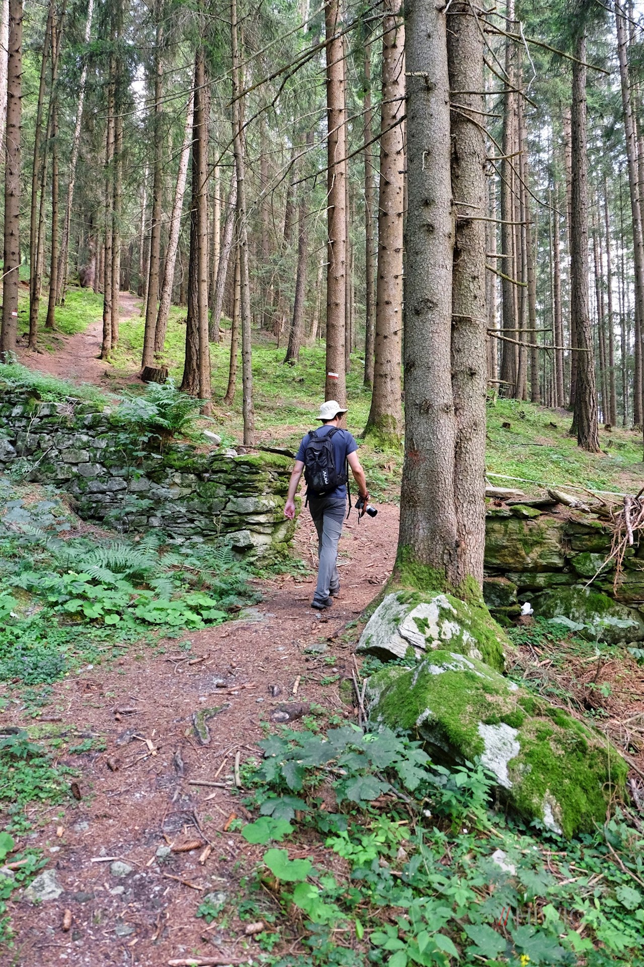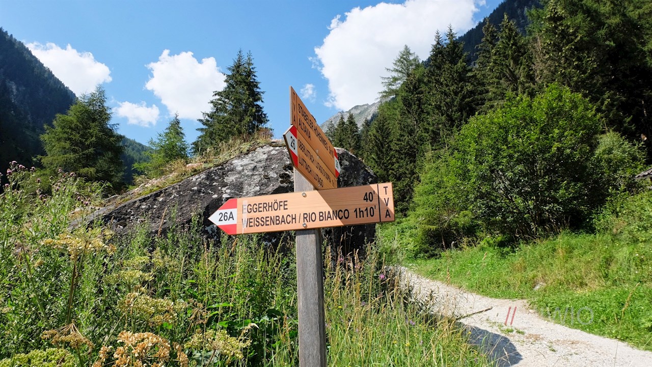 Schließlich zweigt am rechten Wegesrand der Waldsteig nach Luttach ab. Wir aber behalten den breiten Weg bei, der in den Weg Nr. 26A übergeht. Mit Blick auf die bald neben uns aufragenden Felswände des Wolfskofel führt er durch den Wald und über den namengebenden Schwarzbach zur Schwarzbachalm.