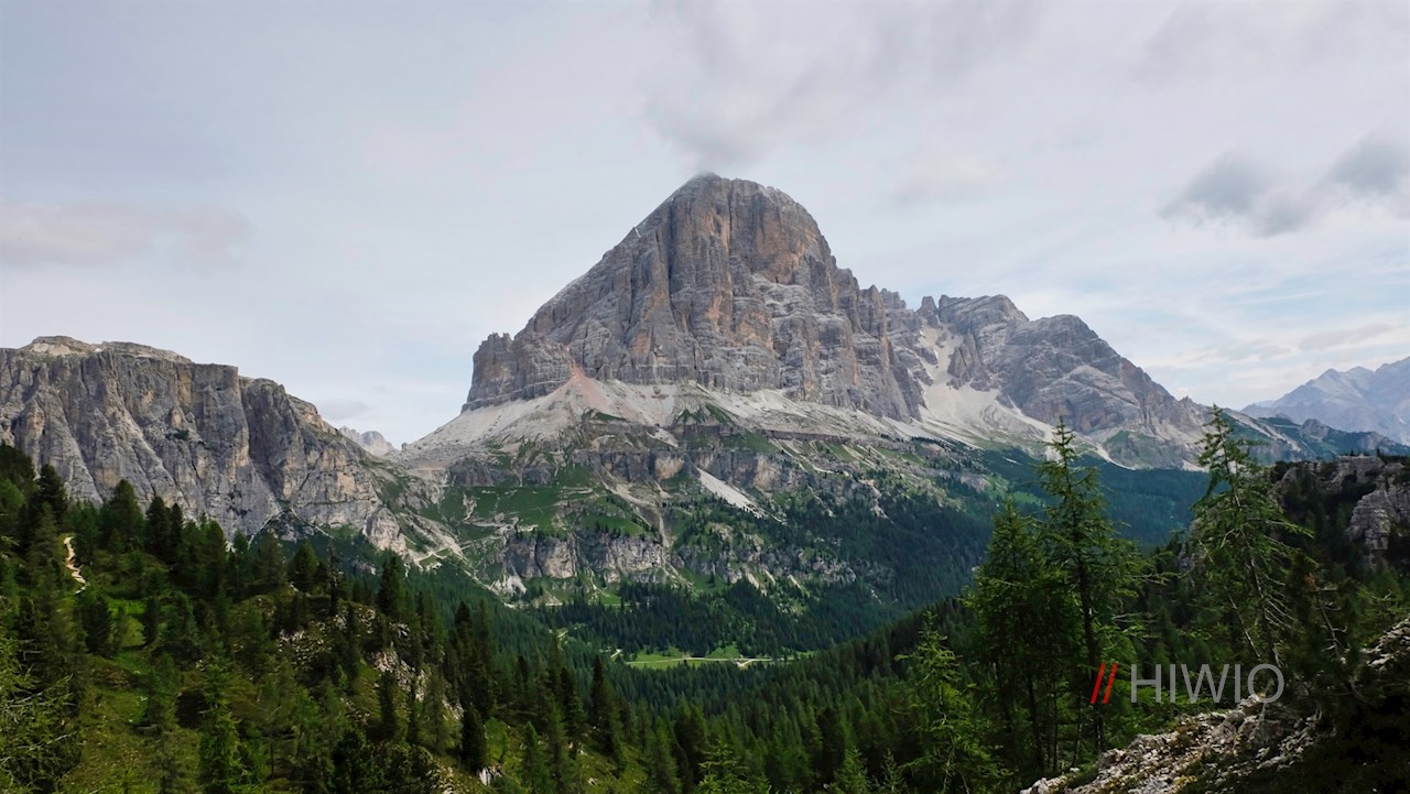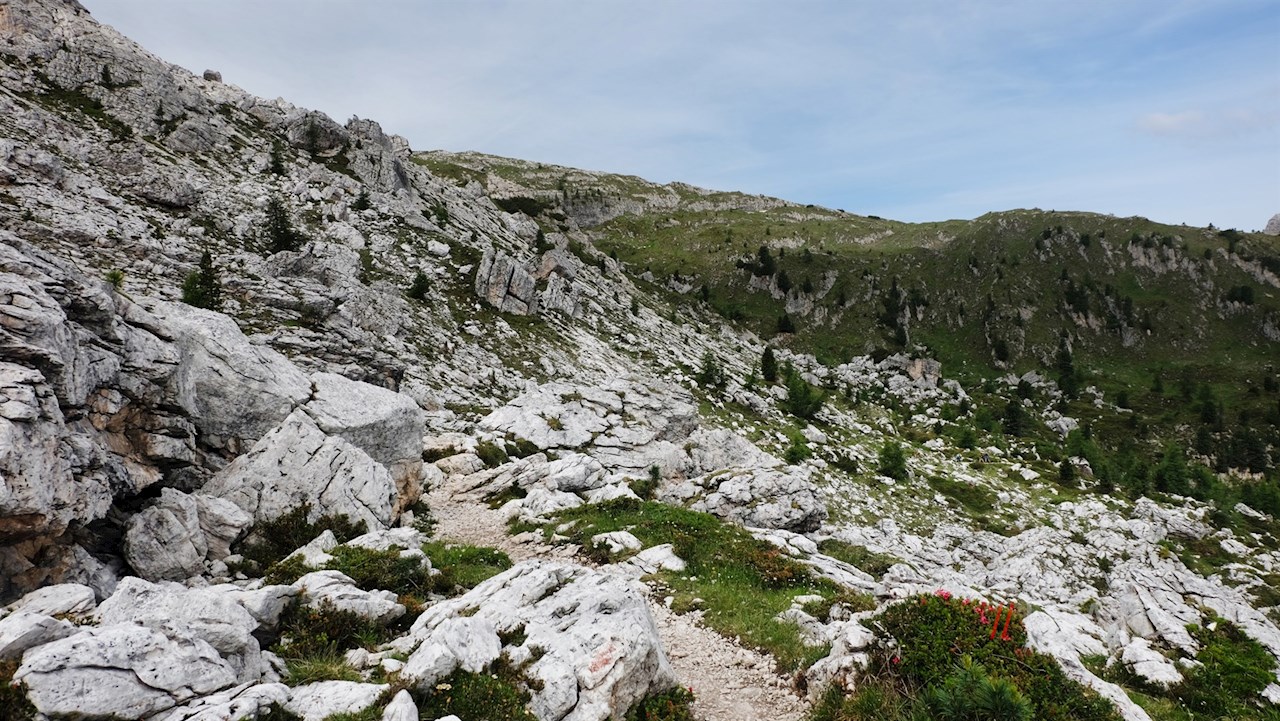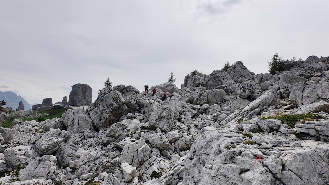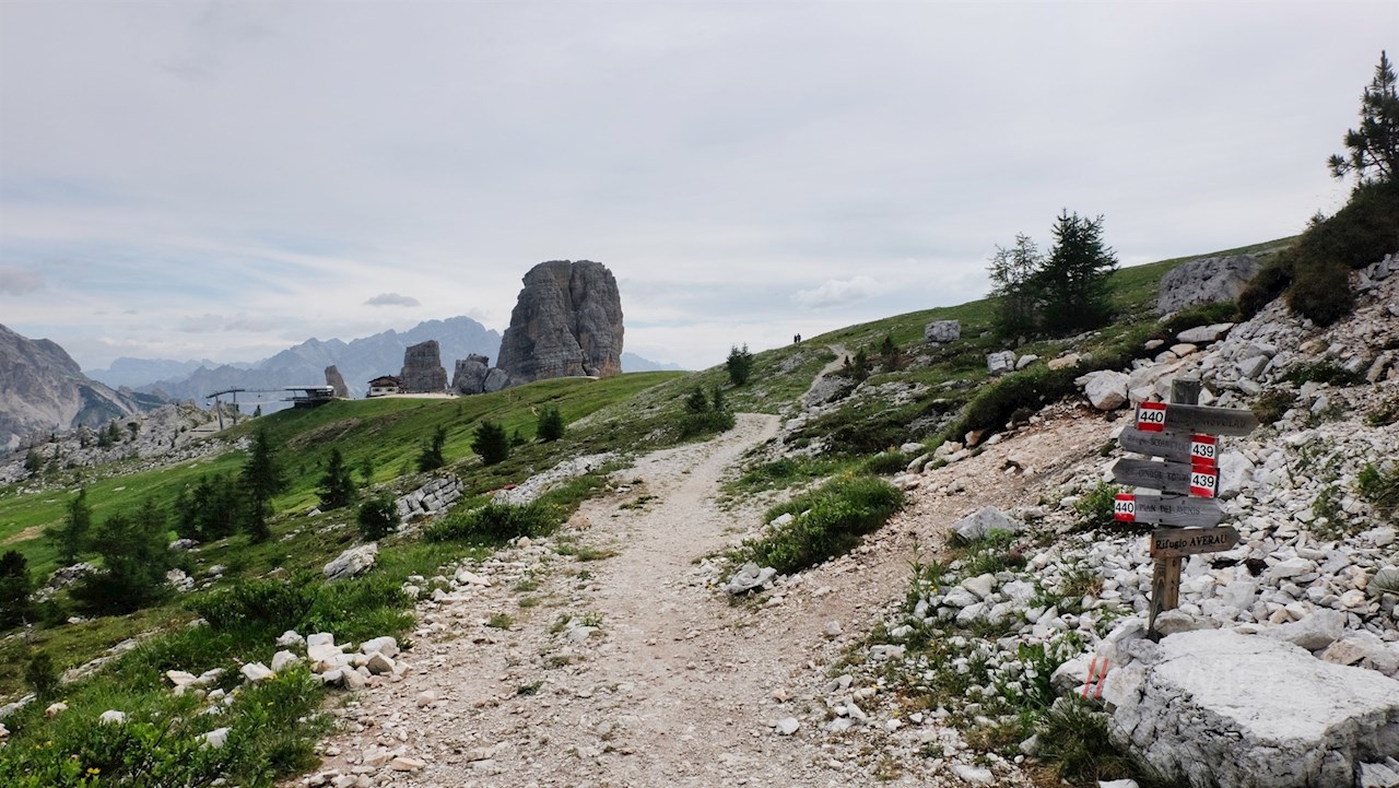 Auf rund 2.000 m Höhe erreicht man die Baumgrenze, hinter der sich eine surreal anmutende Stein- und Geröllwüste ausdehnt. An der nächsten Weggabelung schlägt man den Weg Nr. 439 ein. Er führt vor der atemberaubenden Kulisse der Tofana de Rozes, der Cinque Torri, des Averau und der anderen umliegenden Dolomiten zur nunmehr nahen Scoiattoli Hütte.