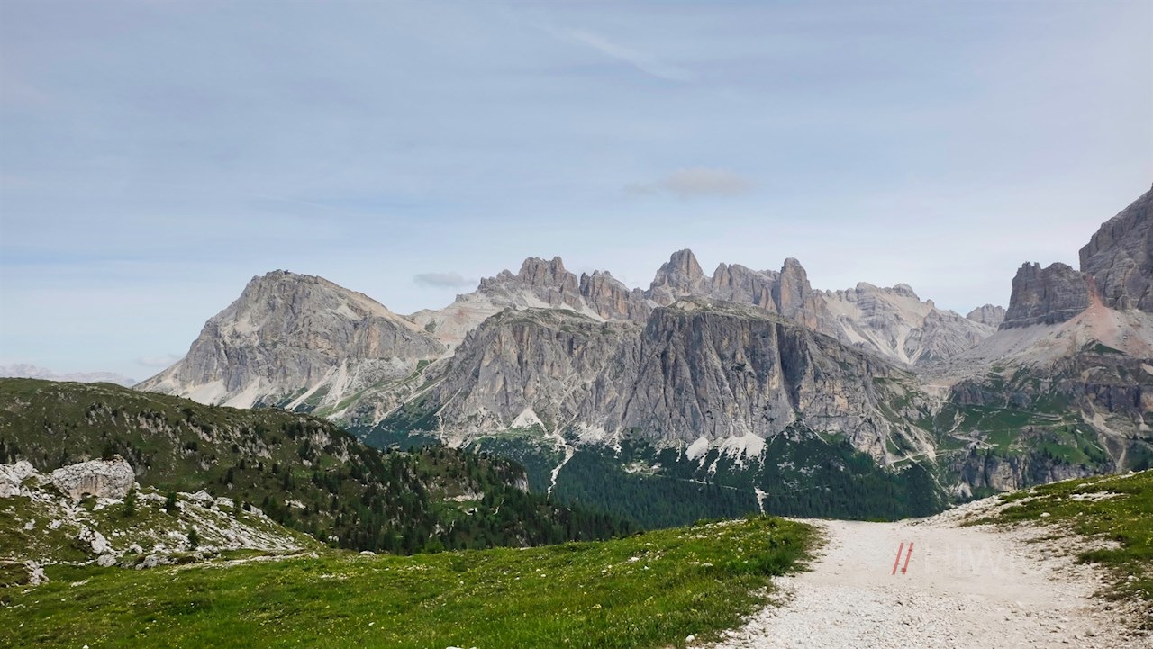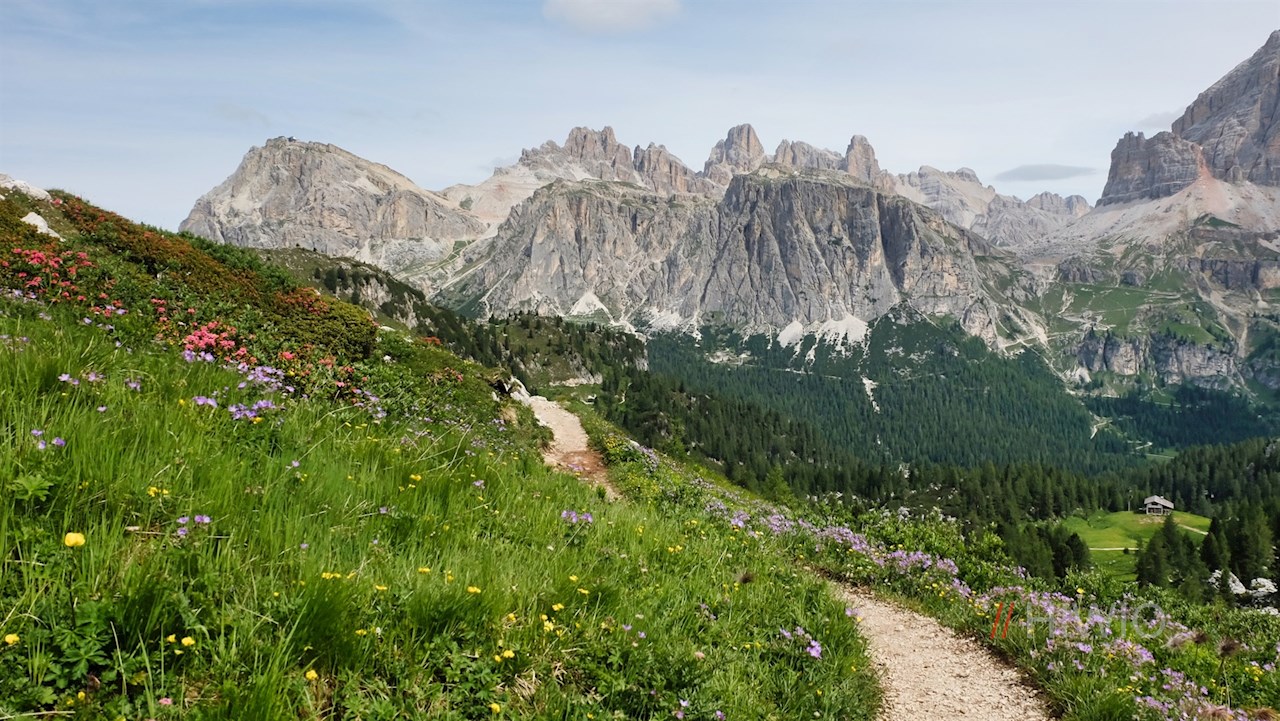 Sollte der Parkplatz auf dem Col Gallina besetzt sein, kann man die Wanderung auch am tiefer gelegenen Bain de Dones neben der Seilbahn starten. Wem Wegweiser Nr. 424 in Richtung Falzaregopass folgend, gelangt man alsbald auf die Blumenwiesen des Pian dei Menis und kann den Weg auf dem oben beschriebenen Weg fortsetzen.