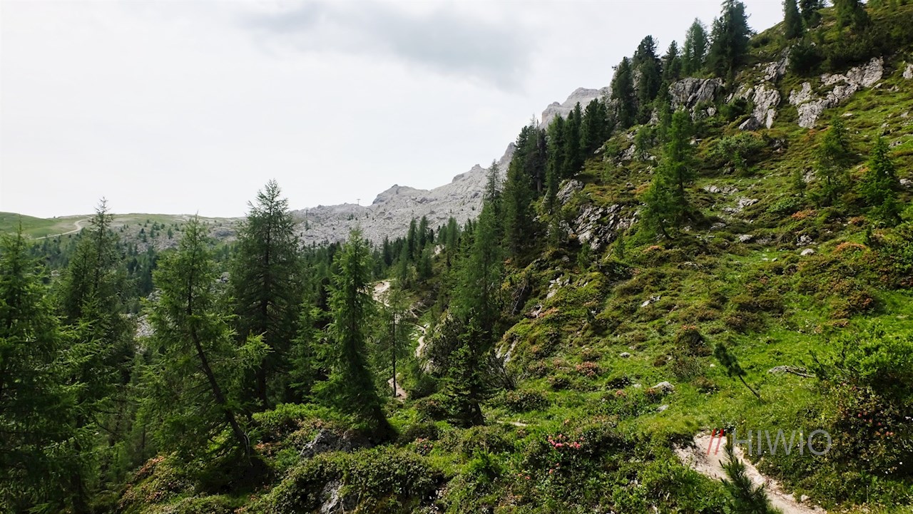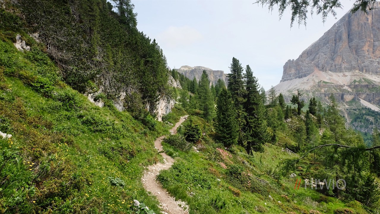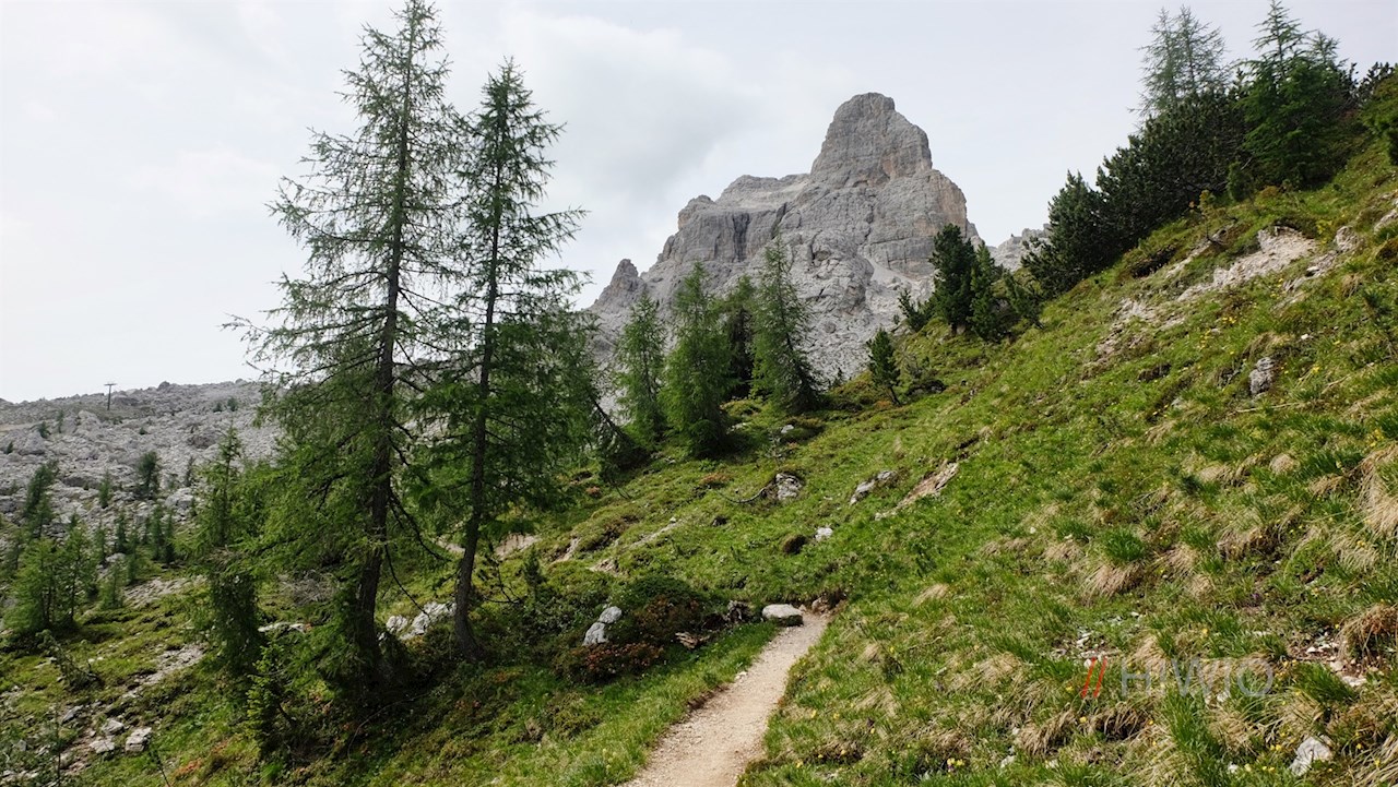 Bei einer kleinen Holzbrücke zweigt rechts der Wanderweg Nr. 440 in Richtung Nuvolau ab. Er tritt wenig später erneut in einen Wald ein, durch den er im bisweilen recht steilen, steinbeschlagenen Anstieg führt. Einige Passagen sind mit stufenförmig angelegten Holzplanken versehen, die den Aufstieg erleichtern.