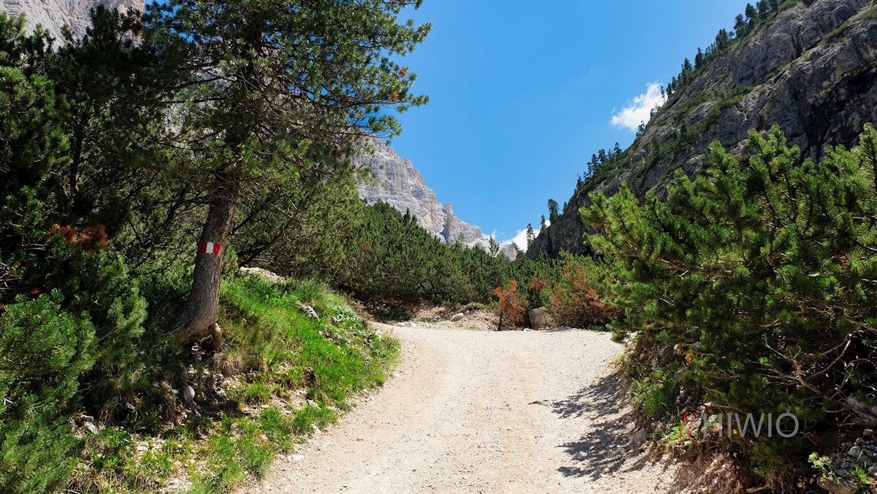 Hier zweigt der sanfte, von Nadelbäumen umsäumte Weg Nr. 11 ab, der nahe dem Restaurant Capanna Alpina in den Weg Nr. 20 übergeht. Anfangs nahezu eben, schlängelt er sich im alsbald steilen Anstieg über latschen- und blumenbewachsene Schotterhänge in Richtung Scotoni Hütte.