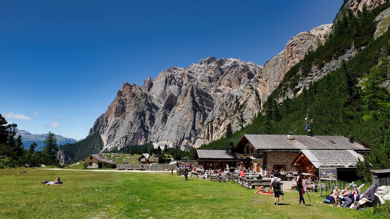 Nach rund einer Stunde steten Wanderns erreicht man diese lauschige, von den mächtigen Felswänden der Seespitze, der Fanesspitzen und der Scotonispitze umstandene Almhütte.
