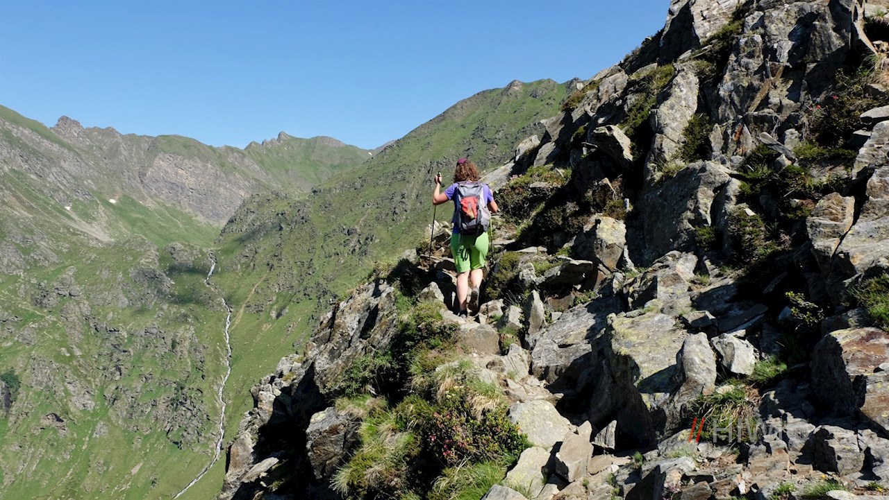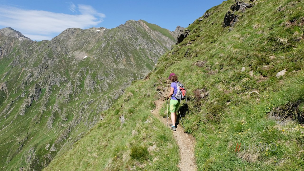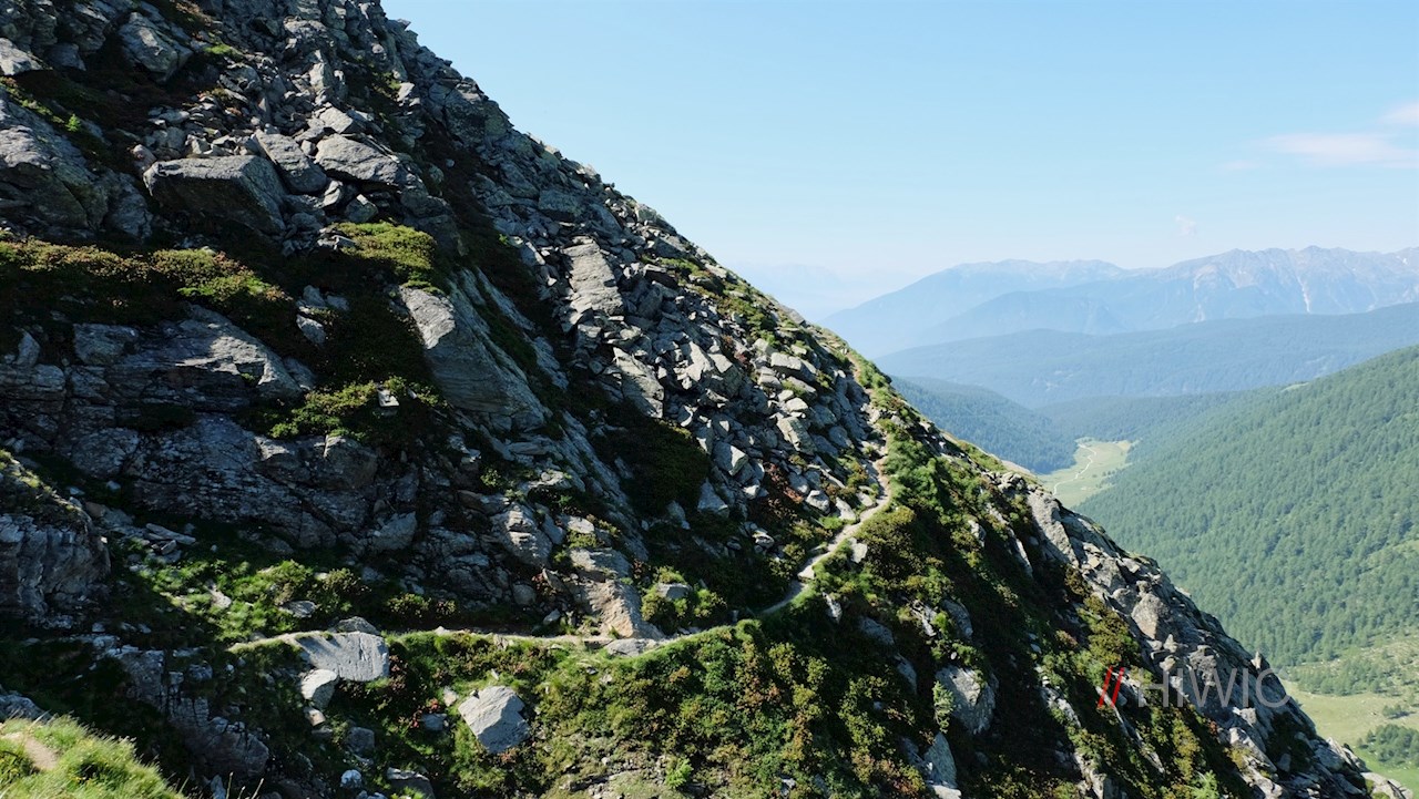 Hier nimmt der Schellenbergsteig seinen Anfang, der dem Wanderer Trittsicherheit und Schwindelfreiheit abverlangt. Der schmale Steig quert nämlich sehr steil abfallende Grashänge und führt dabei über einige felsige Passagen, die teils mit Seilen gesichert sind. Unterwegs eröffnen sich malerische Ausblicke ins Altfasstal und auf die umliegende Bergwelt.