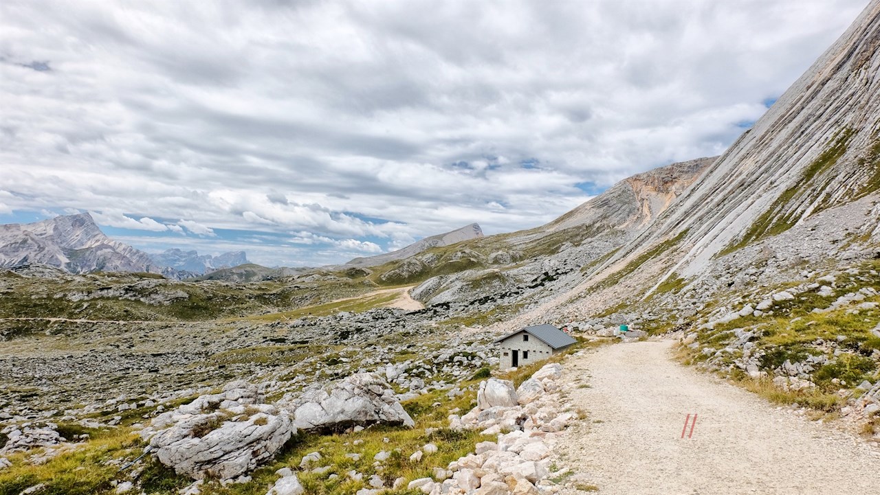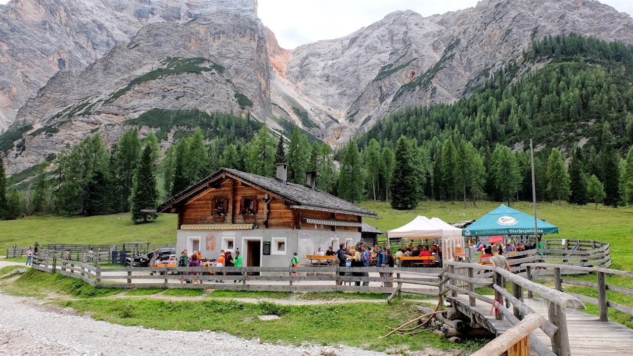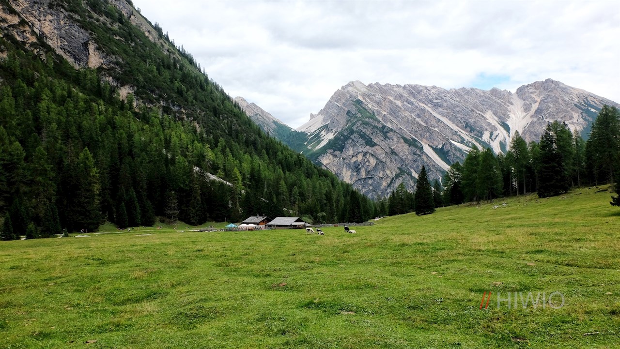 Am beliebten Schutzhaus zweigt der zunächst breite Güterweg Nr. 23 ab. Zu Füßen der imposanten Südwand des wuchtigen Seekofel und der Senneskarspitze führt er nahezu eben durch die aussichtsreiche Bergwelt.