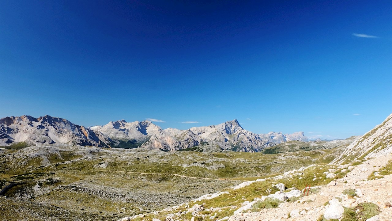 Nach etwa zweieinhalb Stunden erreicht man die sog. Ofenscharte zu Füßen des imposanten Seekofel. Durch dieses auf 2.380 m Höhe gelegene Joch zieht sich die Grenze zwischen Südtirol und dem Belluno.
